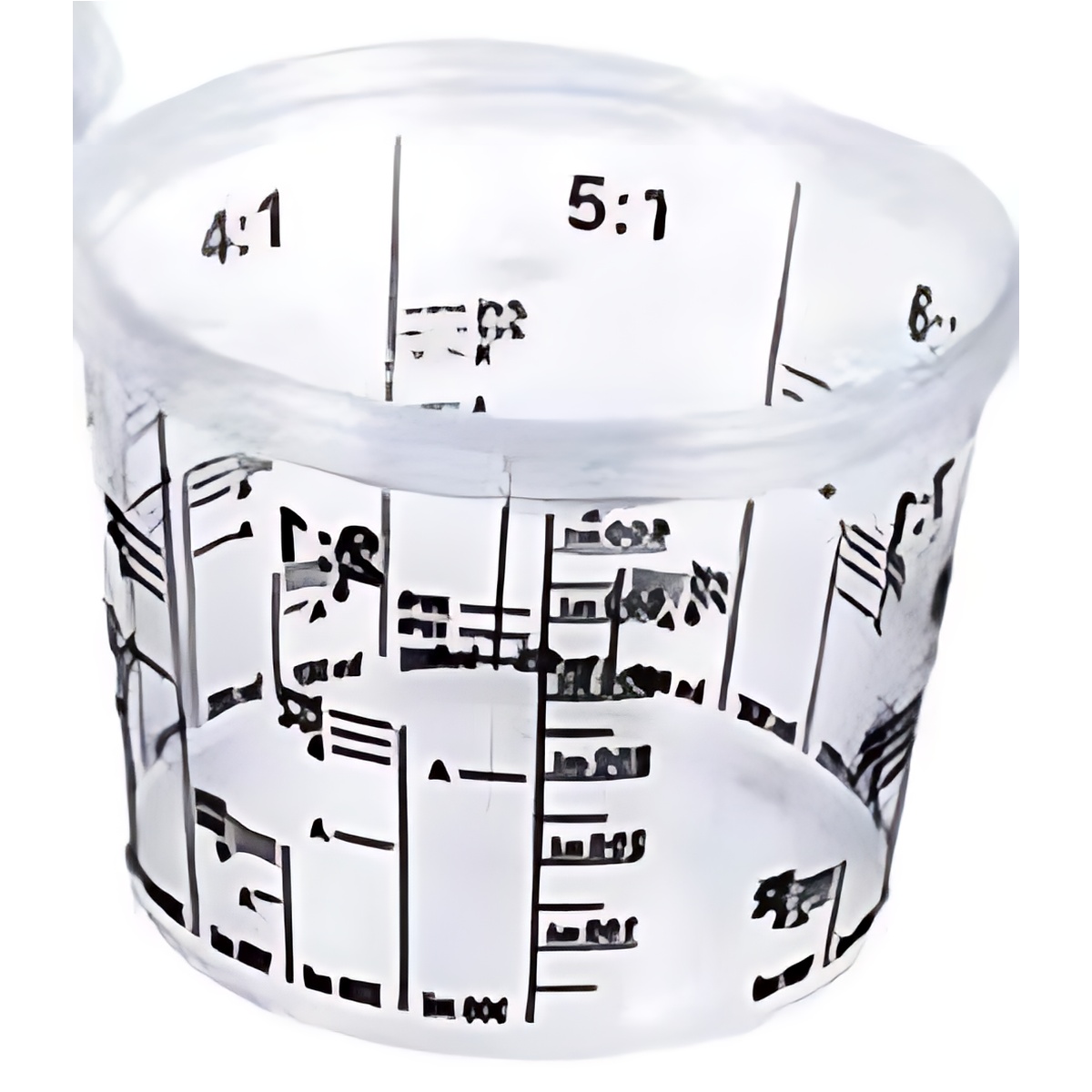 Para pinturas y acrílicos con lectura grabada en el interior Fabricado con polipropileno de alta densidad Borde semirrigido para un cierre hermético Resistente a los disolventes y pinturas mas abrasivas Vaso de mezcla rígico con 5 escalas de medicion desde 1:1 a 1:5 Caja 200 unds