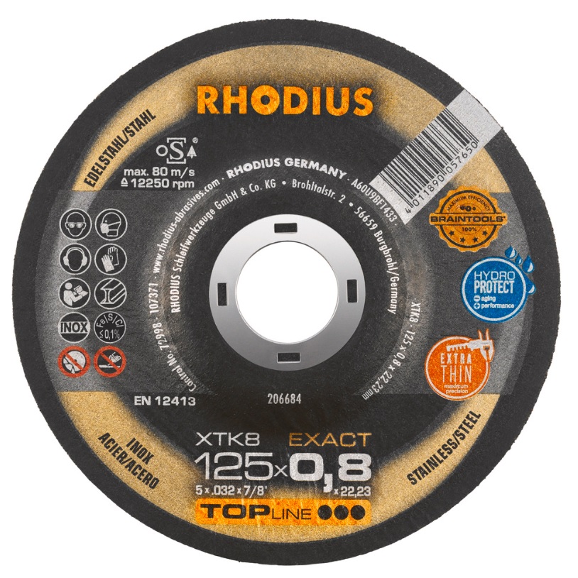 Disco corte inoxidable, superfino de 125 x 0.8 mm KTK8 EXACT, de corte preciso con el menor esfuerzo. Formación mínima de rebaba. Recomendado para soldadura Mig y trabajo en carrocerías. Caja 50 unds.