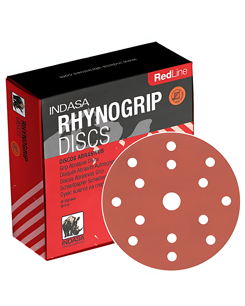 Disco lija velcro de 150 mm de 15 agujeros, grano 1500 Rhynogrip Red line para usos multiples especialmente para el sector del automovil, óptima relacion calidad precio. Caja 50 unds, Iva Incluido