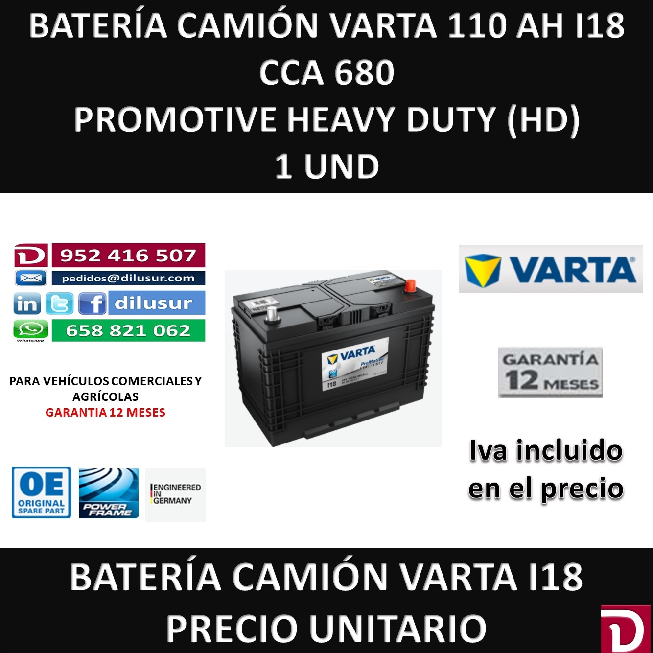Batería camión varta 110 Ah I18, para vehículos comerciales y agrícolas, de arranque fiable, baja autodescarga, resistente a la corrosión y las vibraciones.Medidas largo 347, ancho 173, alto 234. Positivo derecha. Iva incluido en el precio