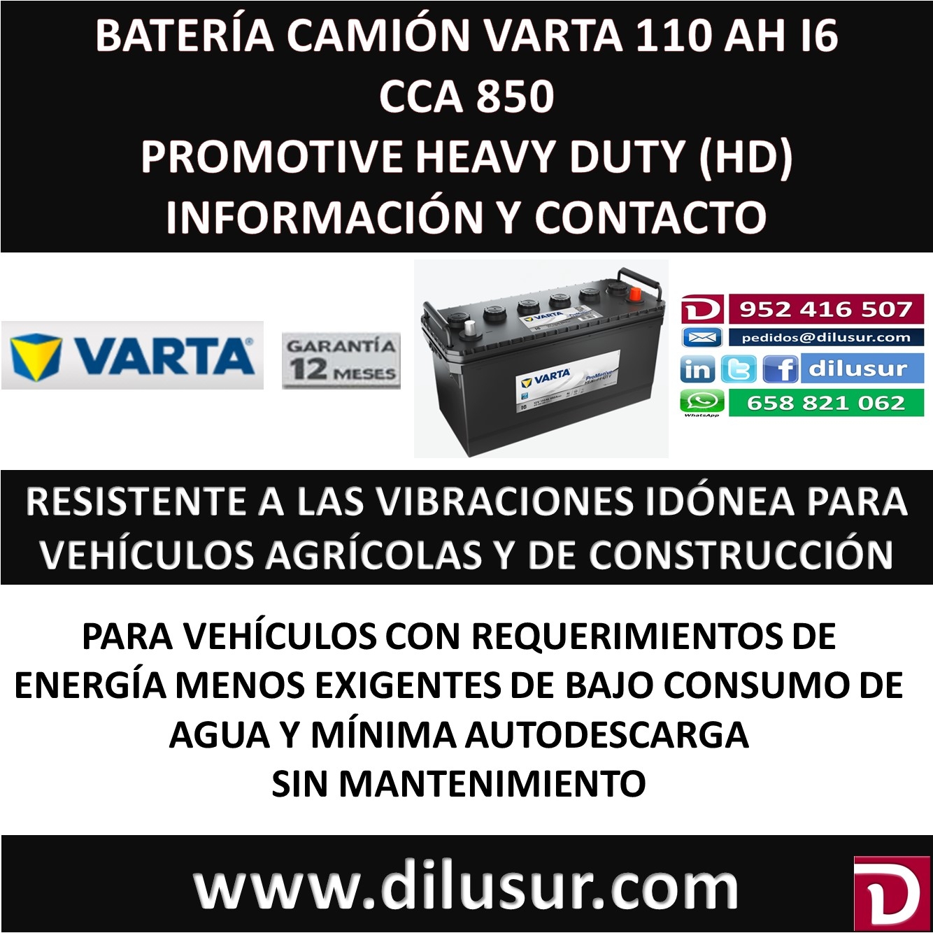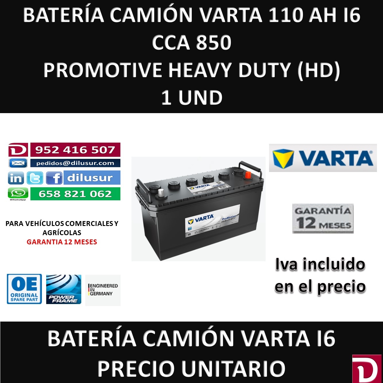 Batería camión varta 110 Ah I6, para vehículos comerciales y agrícolas, de arranque fiable, baja autodescarga, resistente a la corrosión y las vibraciones.Medidas largo 413, ancho 175, alto 220. Positivo derecha. Iva incluido en el precio