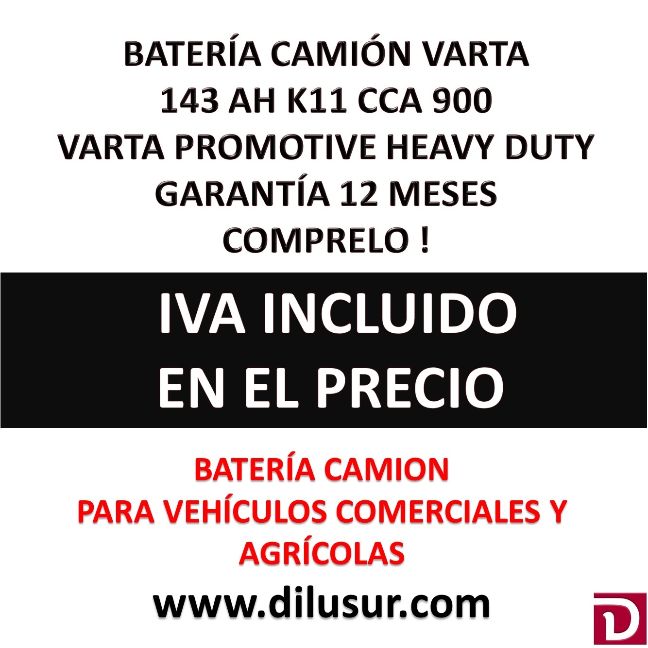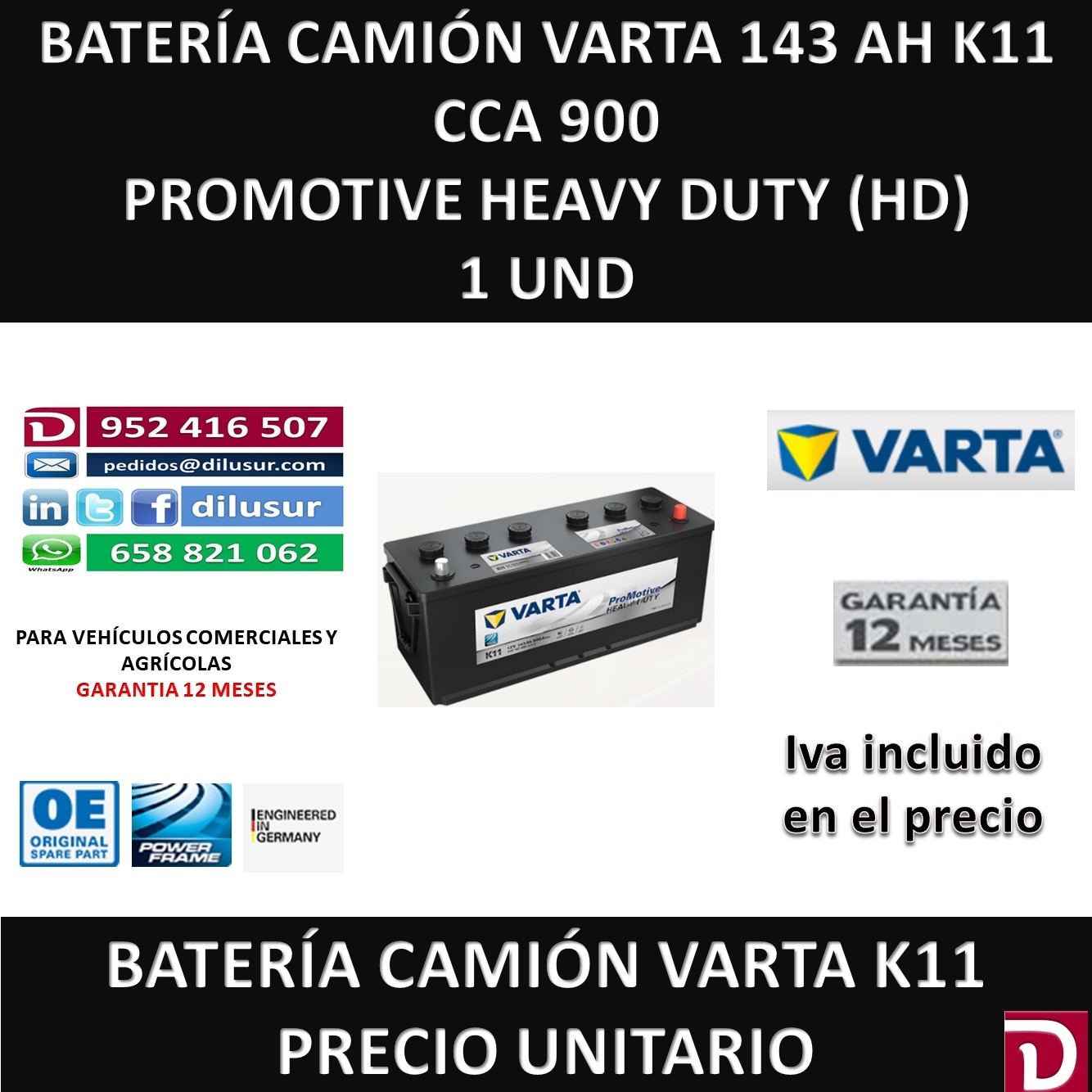 Batería camión varta 143 Ah K11, para vehículos comerciales y agrícolas, de arranque fiable, baja autodescarga, resistente a la corrosión y las vibraciones. Medidas largo 508, ancho 174, alto 205, positivo derecha. Iva incluido en el precio.