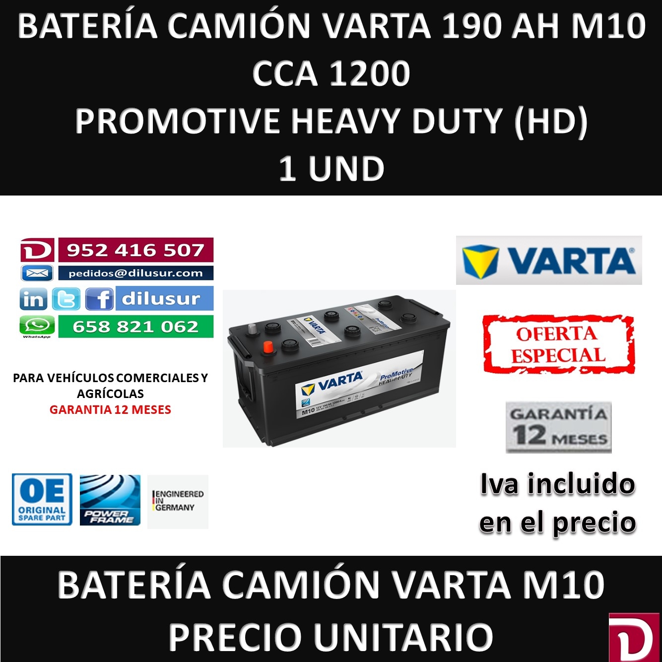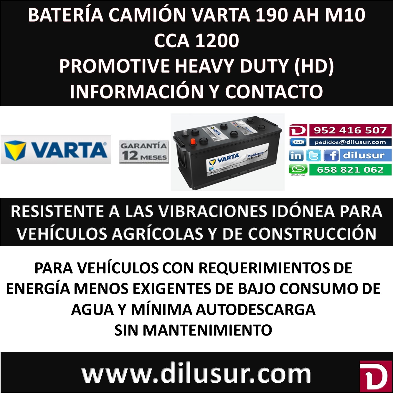 Batería camión varta 190 Ah M10, para vehículos comerciales y agrícolas, de arranque fiable, baja autodescarga, resistente a la corrosión y las vibraciones. Medidas largo 513, ancho 223, alto 223, Bornas lateral izquierdo. Iva incluido en el precio.