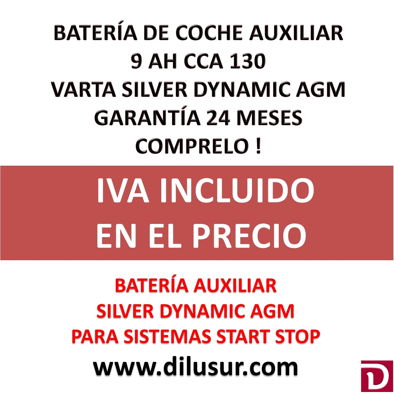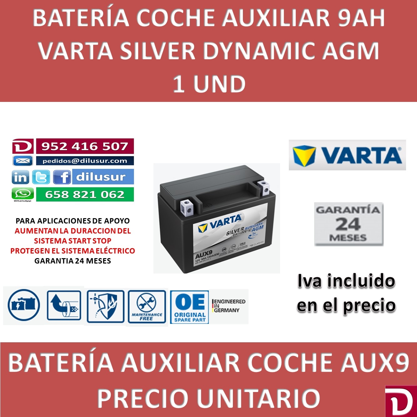 Batería Auxiliar Varta 9 Ah Aux9, aumenta la duración del sistema Start Stop, respaldan al sistema eléctrico (control de frenado electrónico), sin manteni miento. medidas Largo 151,ancho 87, alto 106 mm. Positivo izquierda. Iva incluido.