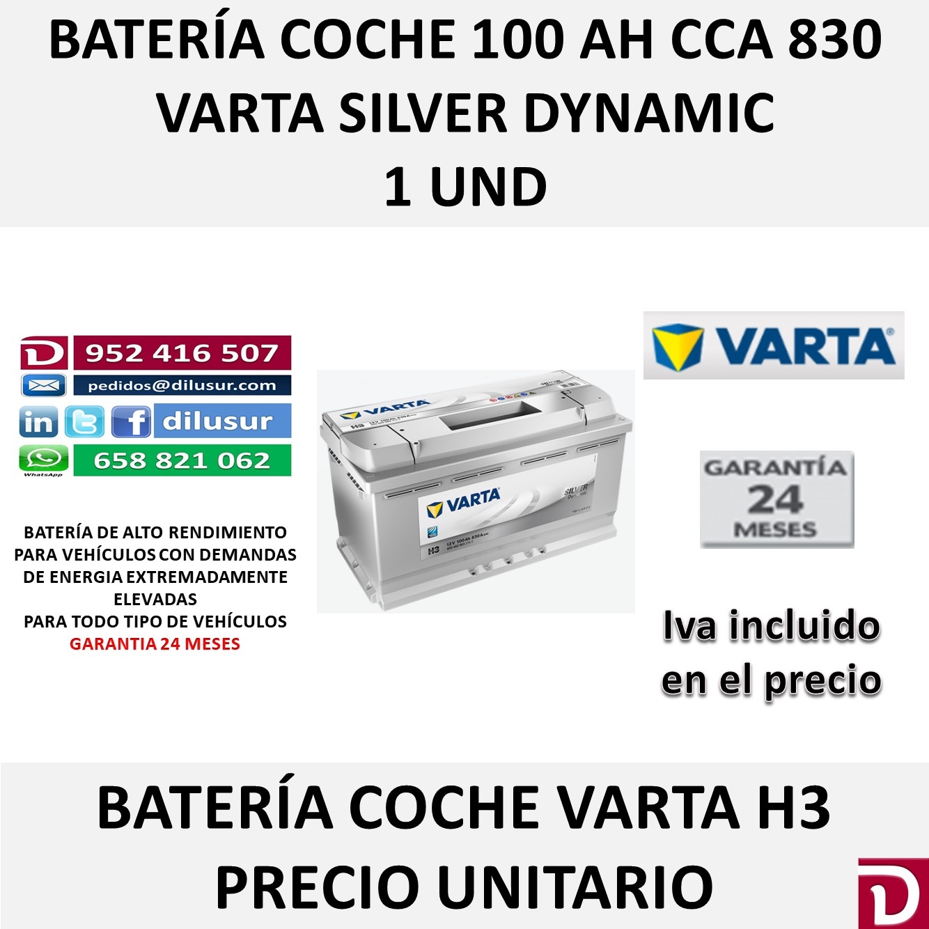 Bateria de arranque varta 100 Ah, H3 Silver Dynamic, para vehículos de alto rendimiento con demanda de energia elevada, medidas largo 353, ancho 175 y alto 190, positivo derecha. Iva incluido