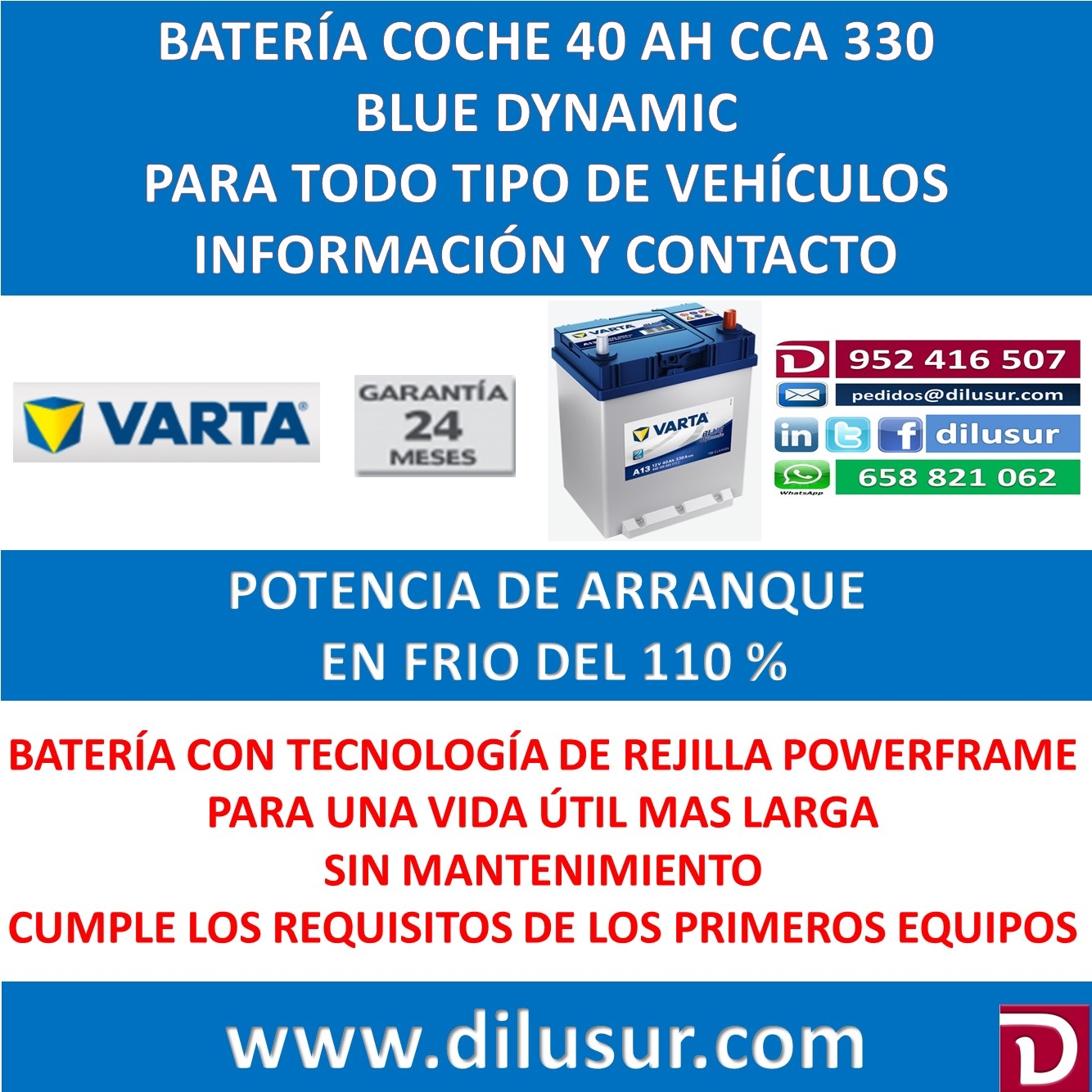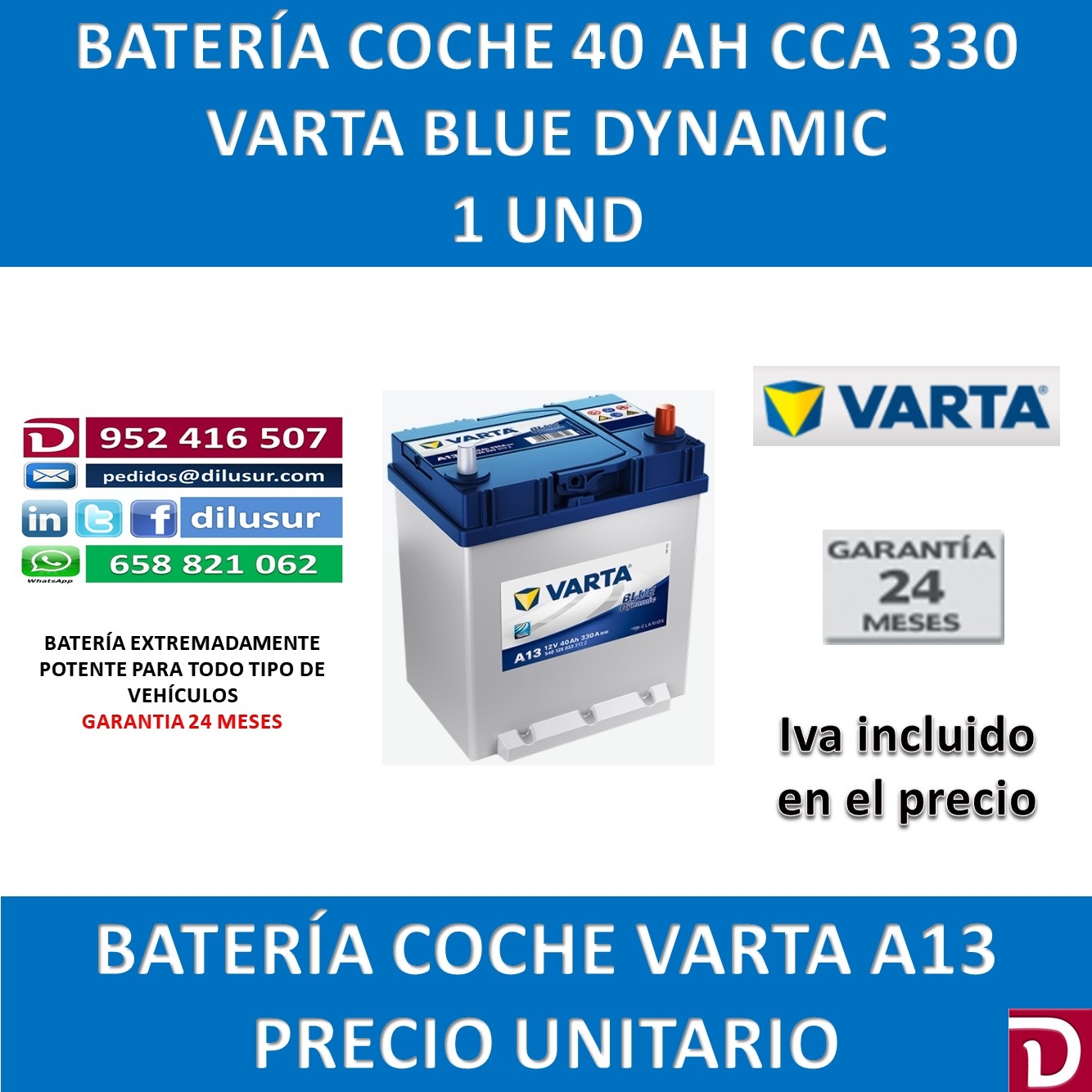 Bateria de arranque varta 40 Ah, A13 Blue Dynamic, de una durabilidad superior a dos veces el ciclo de vida de una bateria convencional, para todo tipo de vehículos, medidas largo 187, ancho 127 y alto 227. positivo a la derecha. Iva incluido