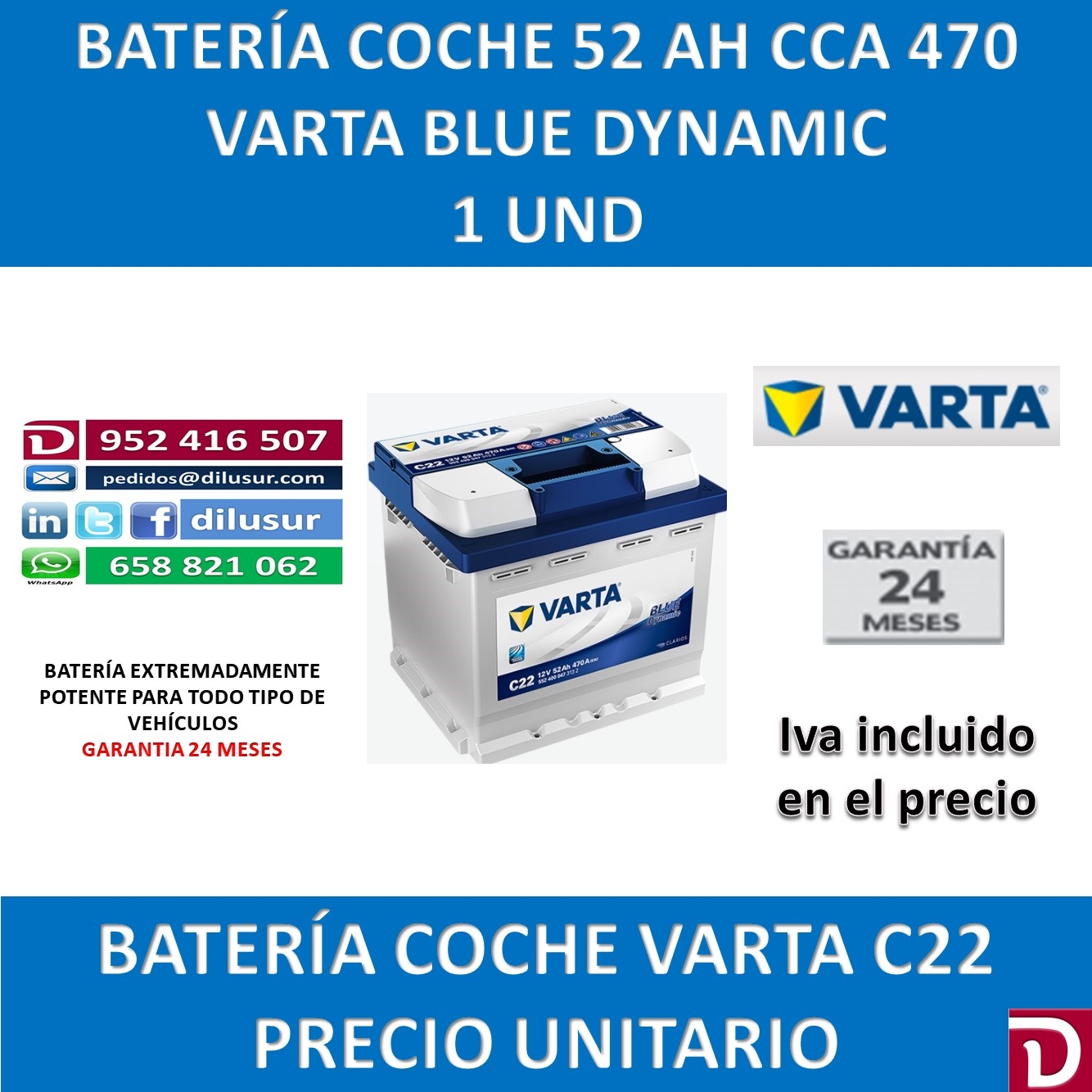 Bateria de arranque varta 52 Ah, C22 Blue Dynamic, de una durabilidad superior a dos veces el ciclo de vida de una bateria convencional, para todo tipo de vehículos, medidas largo 207, ancho 175 y alto 190, positivo derecha. Iva incluido