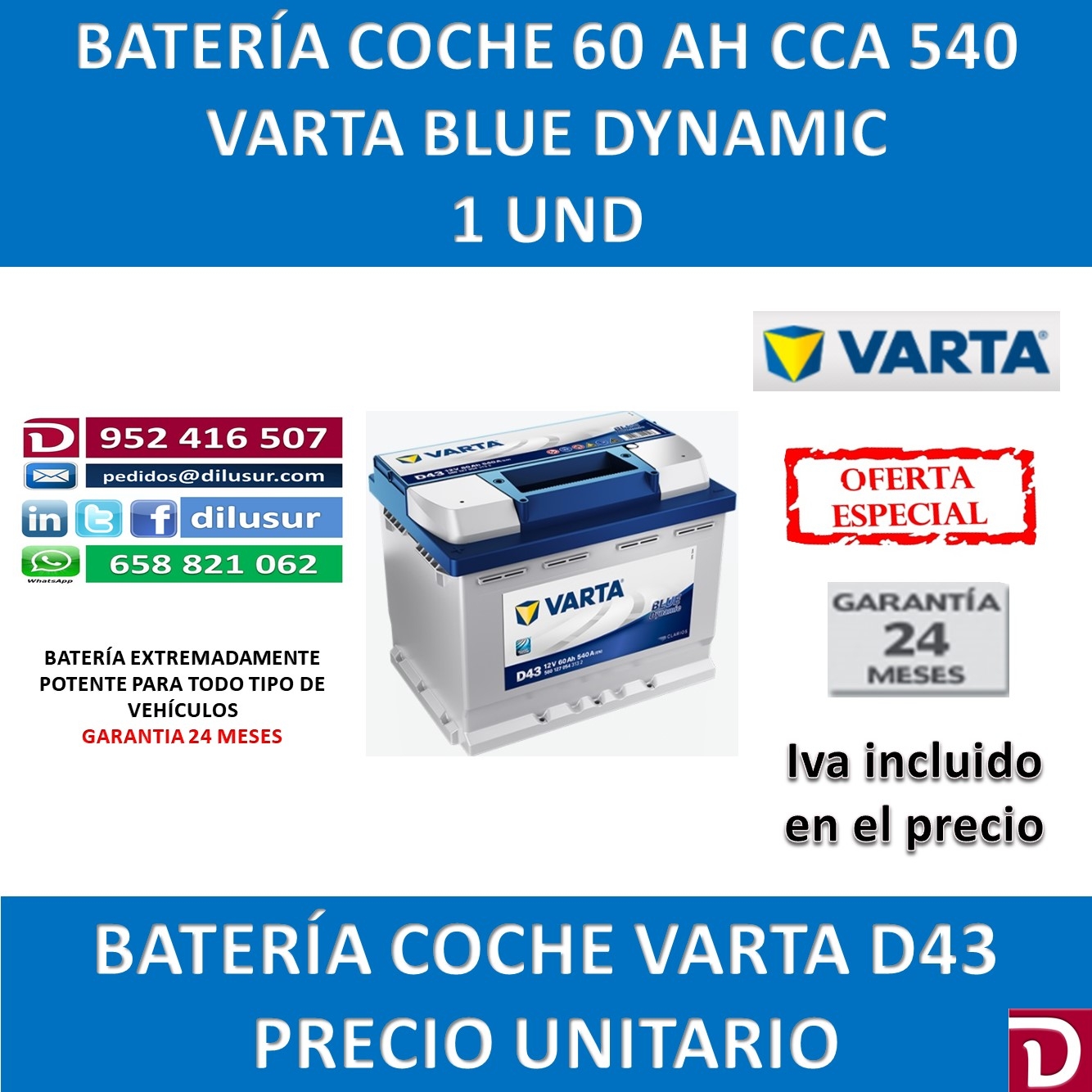Bateria de arranque varta 60 Ah, D43 Blue Dynamic, de una durabilidad superior a dos veces el ciclo de vida de una bateria convencional, para todo tipo de vehículos, medidas largo 242, ancho 175 y alto 190, positivo izquierda. Iva incluido