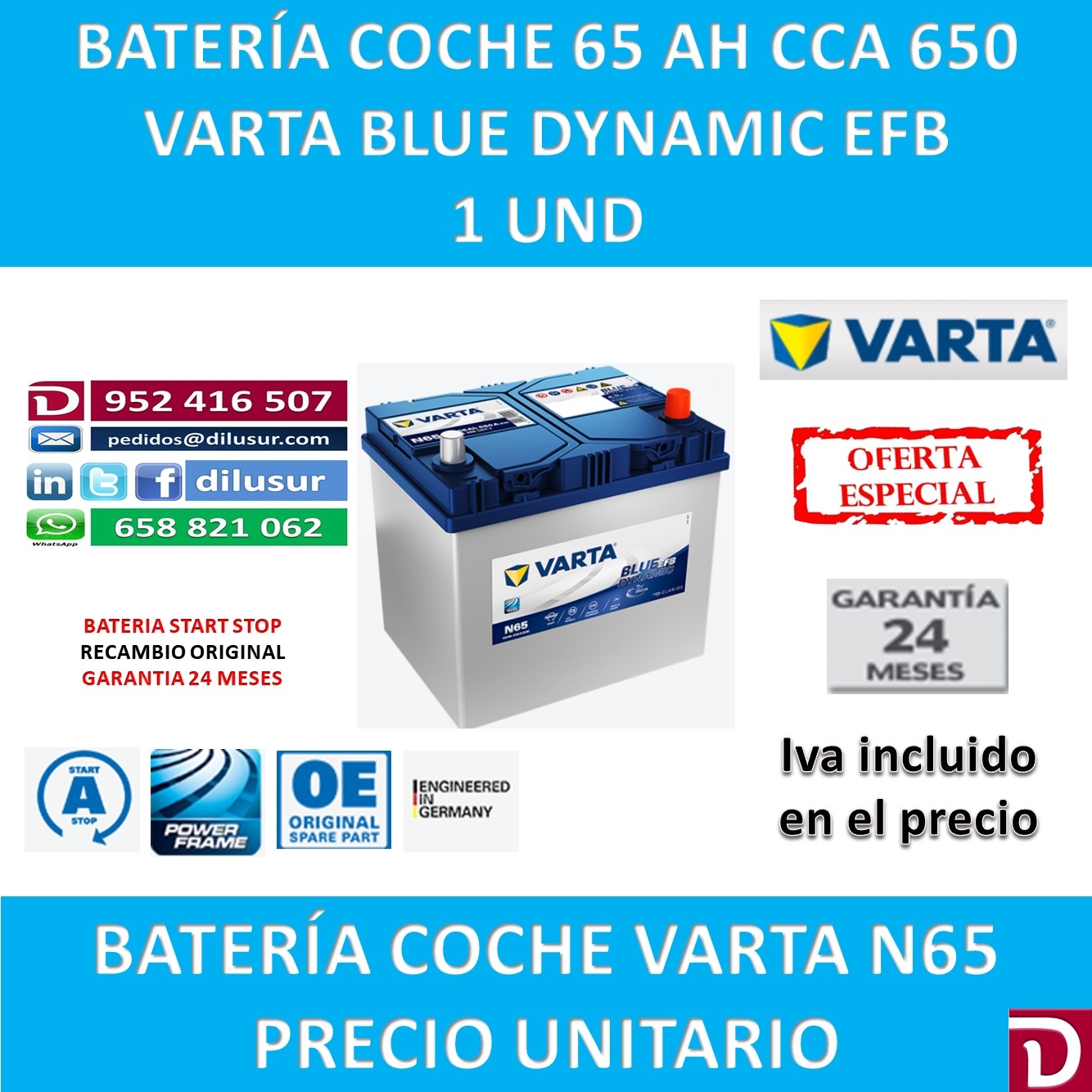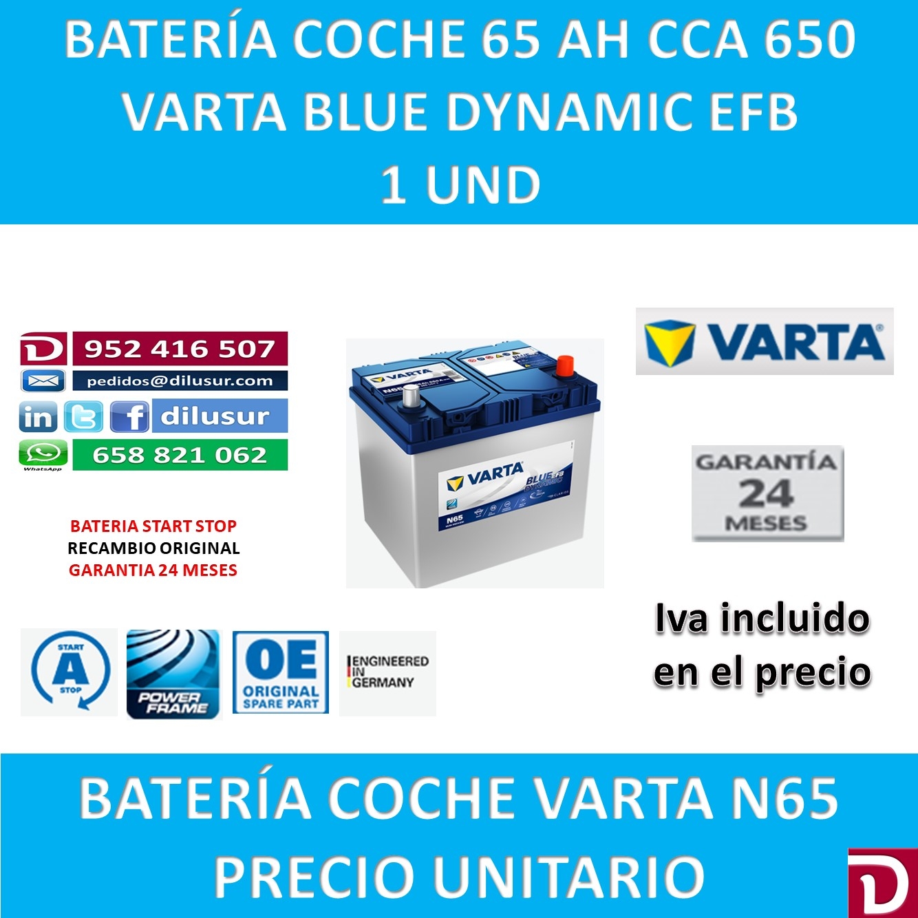 Bateria de arranque Start Stop varta 65 Ah, N65 Blue Dynamic, con un ciclo de vida dos veces superior una bateria convencional, para todo tipo de vehículos, medidas largo 232, ancho 173 y alto 225, positivo derecha. Iva incluido