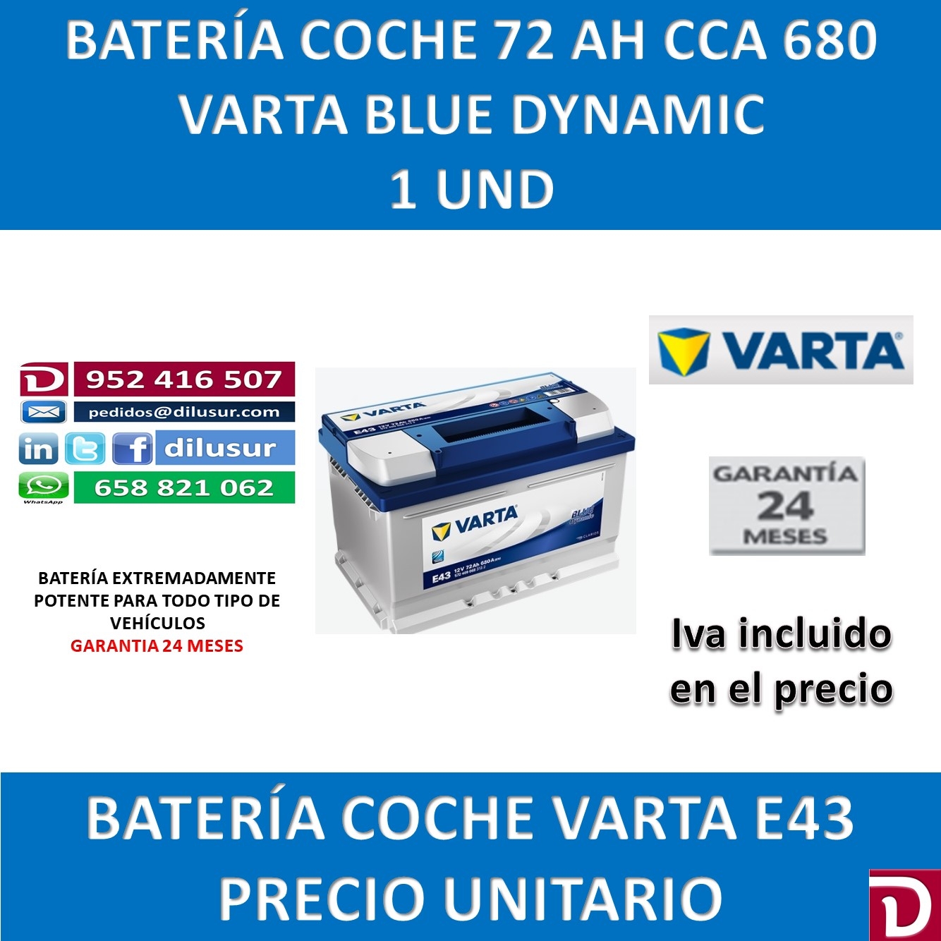 Bateria de arranque varta 72 Ah, E43 Blue Dynamic, de una durabilidad superior a dos veces el ciclo de vida de una bateria convencional, para todo tipo de vehículos, medidas largo 278, ancho 175 y alto 175, positivo derecha. Iva incluido