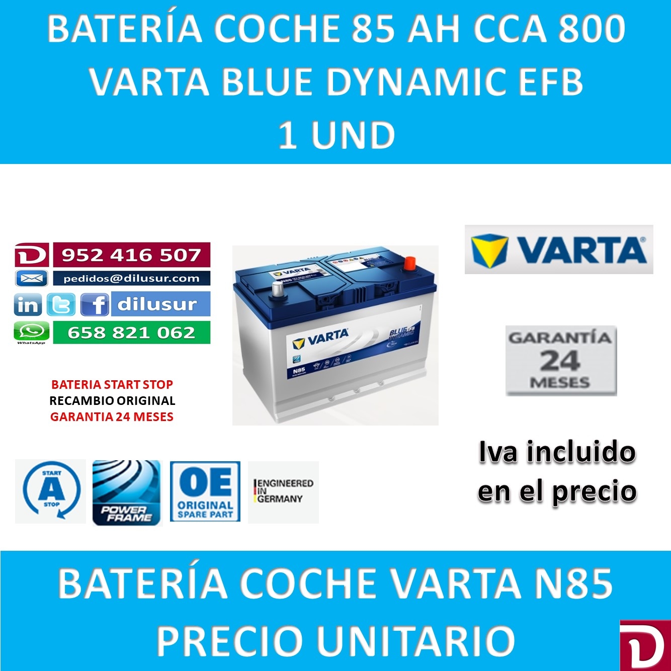 Bateria de arranque Start Stop varta 85 Ah, N85 Blue Dynamic, con un ciclo de vida dos veces superior una bateria convencional, para todo tipo de vehículos, medidas largo 306, ancho 175 y alto 225, positivo derecha. Iva incluido