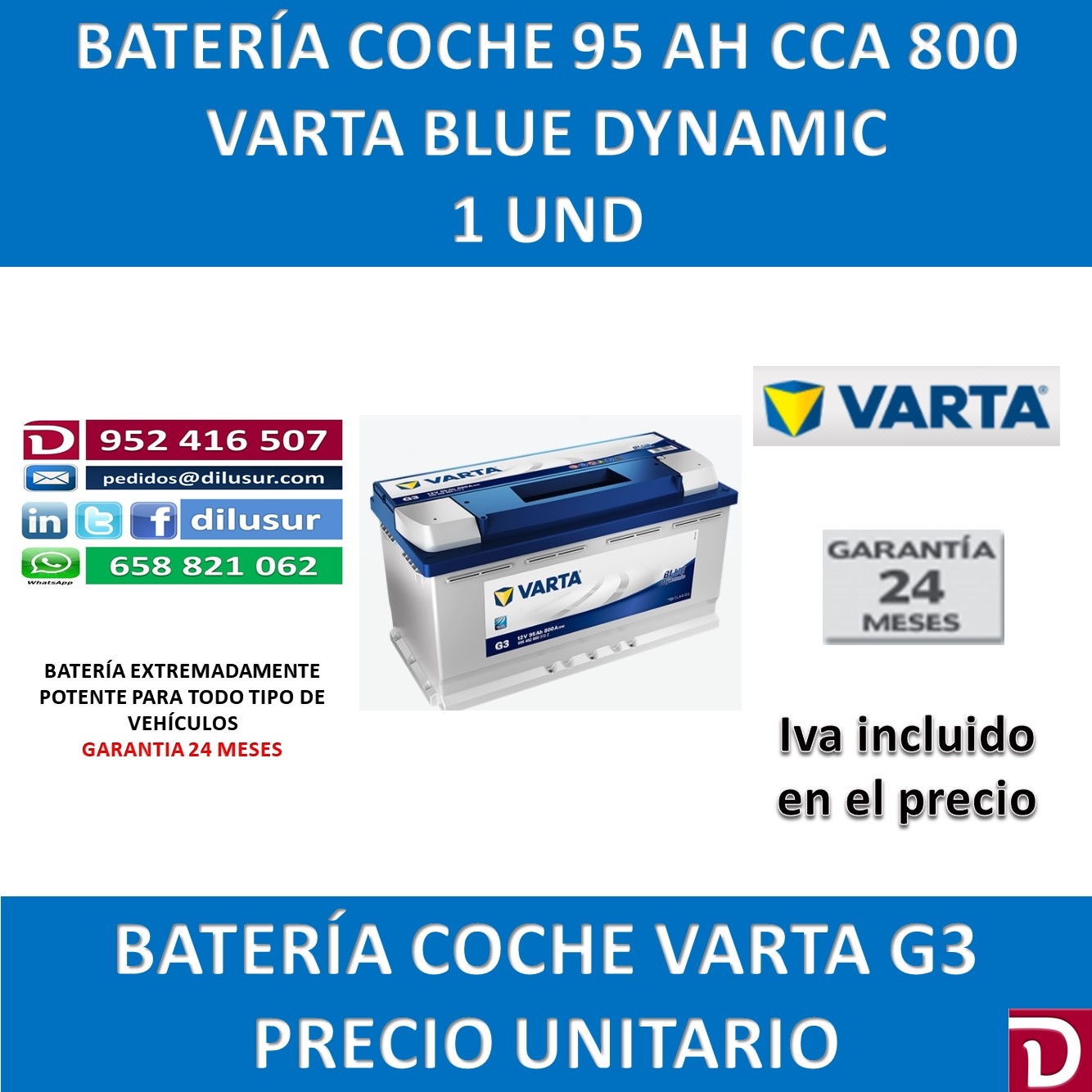Bateria de arranque varta 95 Ah, G3 Blue Dynamic, de una durabilidad superior a dos veces el ciclo de vida de una bateria convencional, para todo tipo de vehículos, medidas largo 353, ancho 175 y alto 190, positivo derecha. Iva incluido