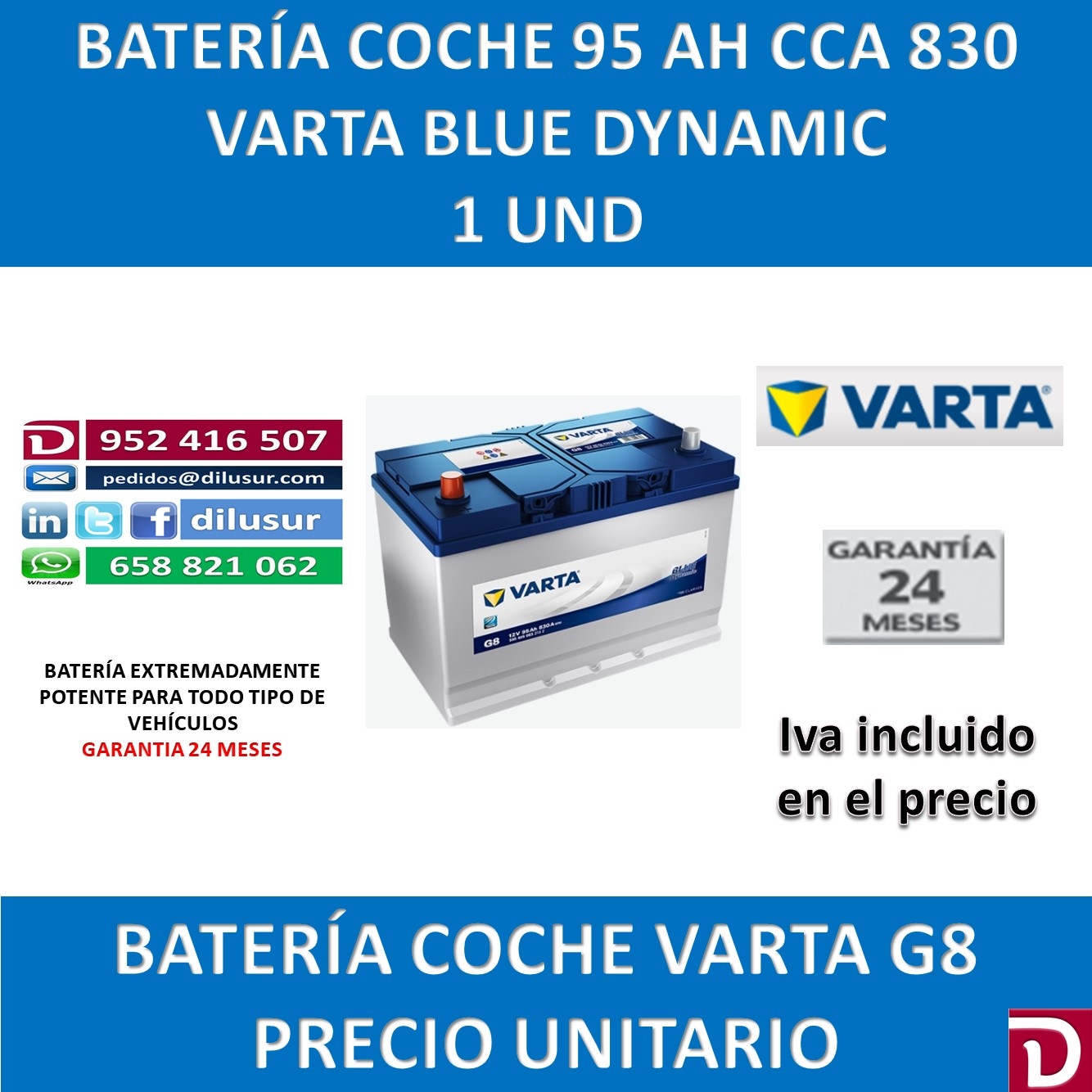 Bateria de arranque varta 95 Ah, G8 Blue Dynamic, de una durabilidad superior a dos veces el ciclo de vida de una bateria convencional, para todo tipo de vehículos, medidas largo 306, ancho 173 y largo 225, positivo izquierdo. Iva incluido