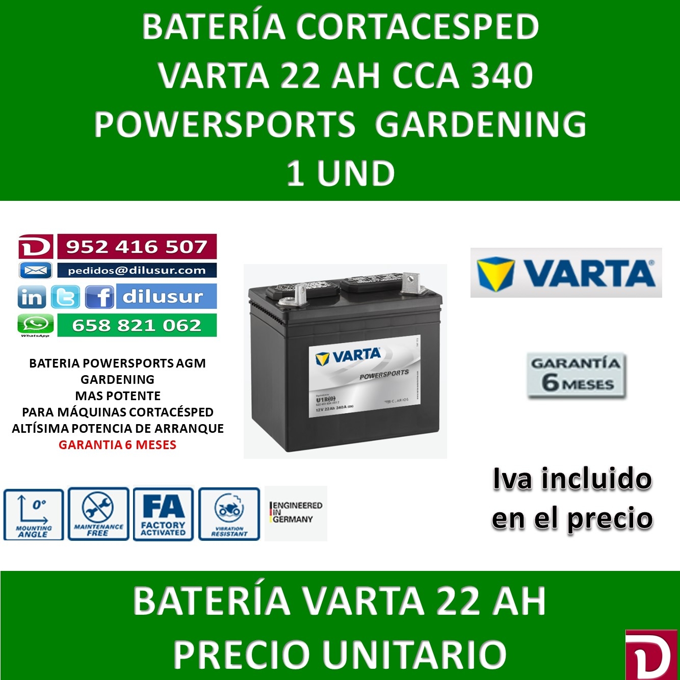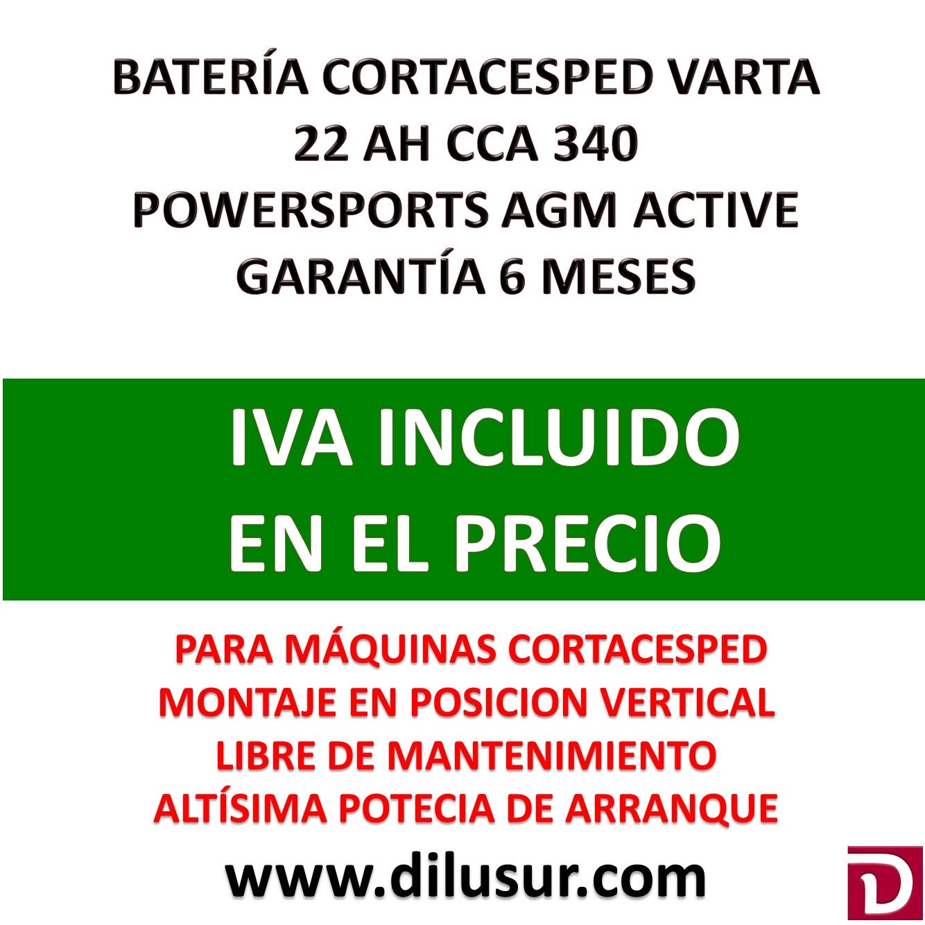 Ofertada al mejor precio del mercado para que el consumidor no tenga que acudir a otras marcas menos fiables. AGM activada de fábrica lista para trabajar Cargada y llenada con precisión, sellada de forma permantente Sin derrames, 100% libre de mantenimiento Mayor vida útil Mayor resistencia a las vibraciones Montaje en posicion vertical Muy resistente a las vibraciones Baja autodescarga Adaptable a cualquier cortacésped
