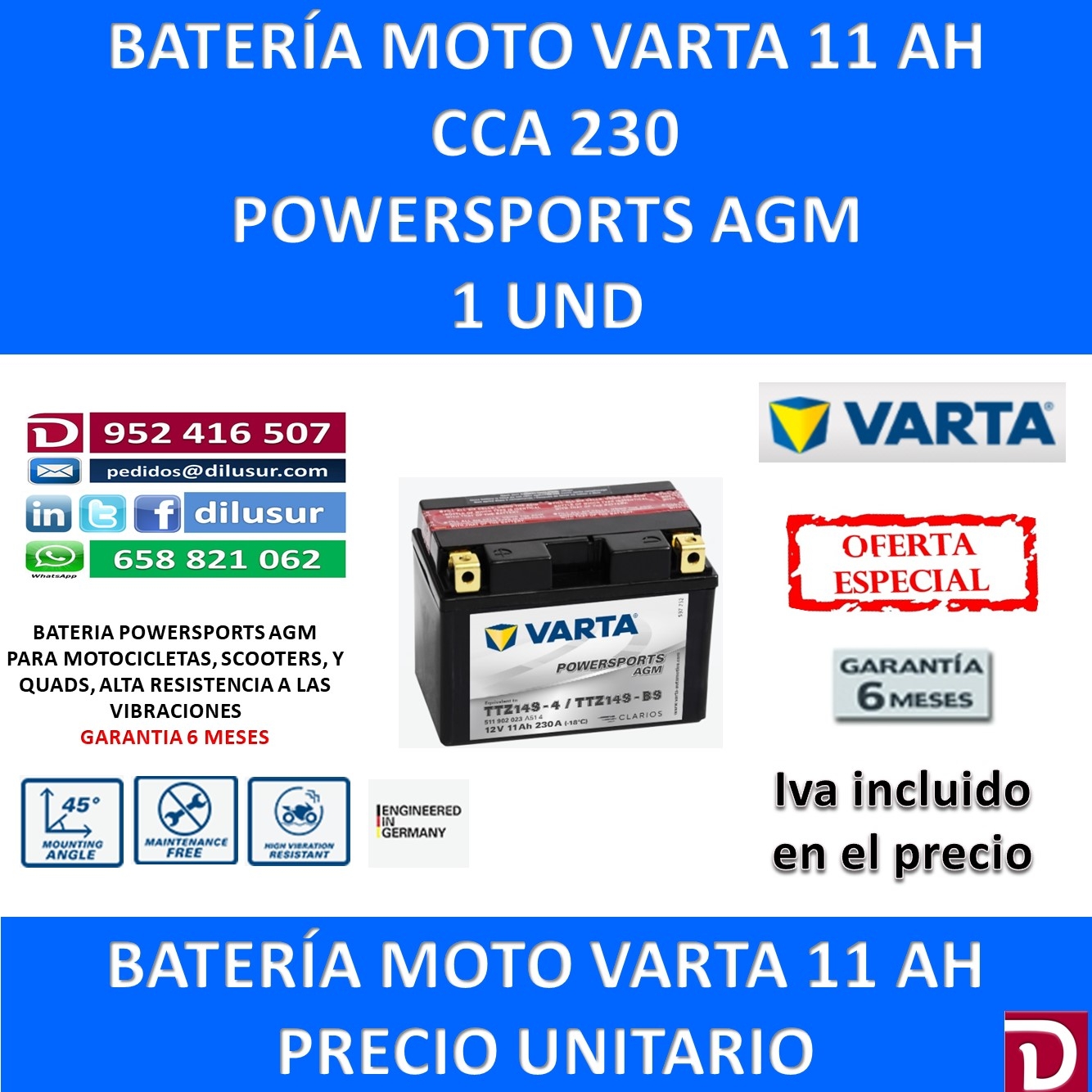 Batería Varta Moto 11 Ah CCA 230 A Ofertada al mejor precio del mercado para que el consumidor no tenga que acudir a otras marcas menos fiables. Batería con carga en seco en versión Freshpack (con recipiente de ácido) No requiere mantenimiento, no es necesario rellenarla Cumple la norma JLS A prueba de vuelcos y derrames en ángulos de hasta 45° Cuenta con la tecnología AGM (Absorbent Glass Mat), lo que hace que la batería se pueda cargar y descargar una y otra vez sin que ello afecte al rendimiento.
