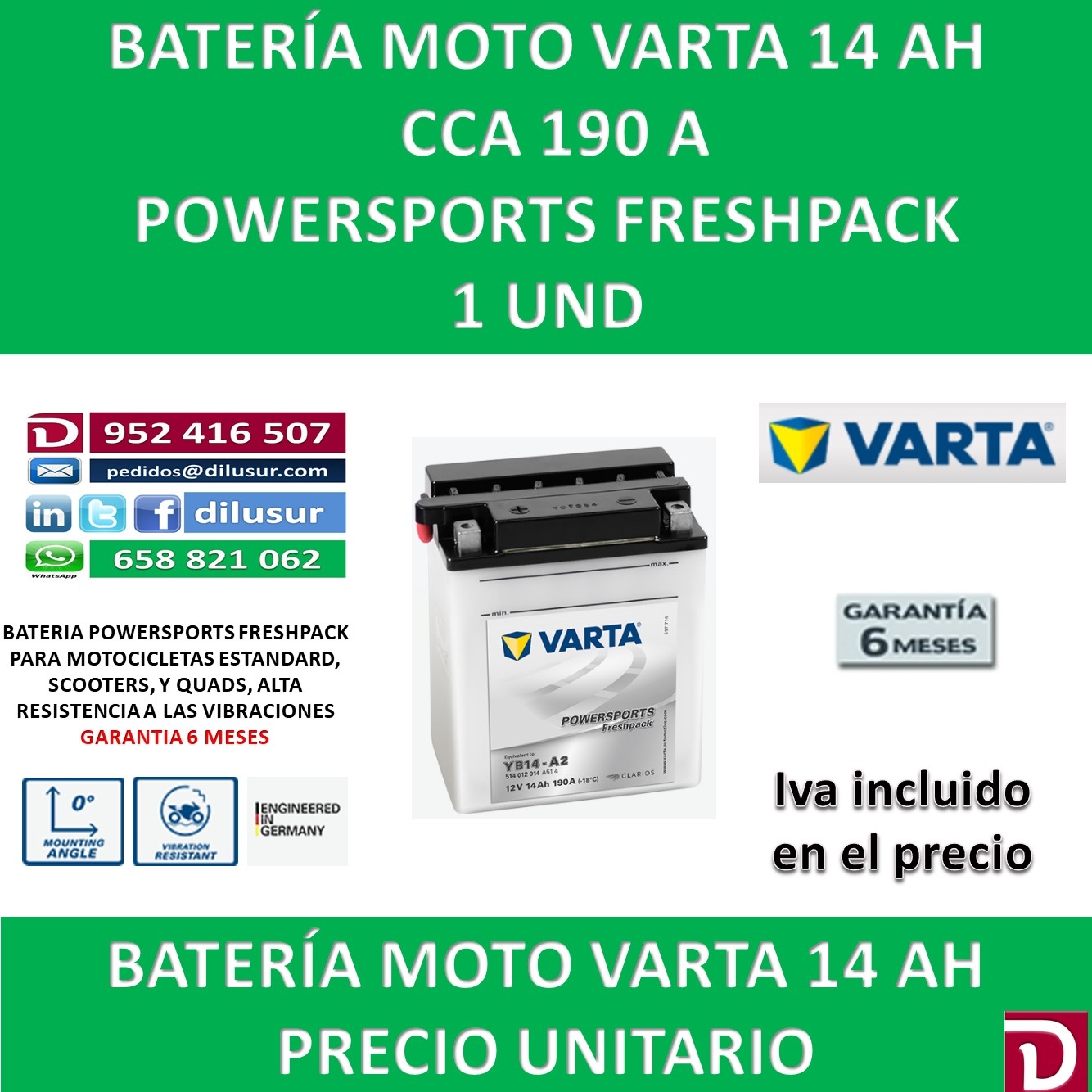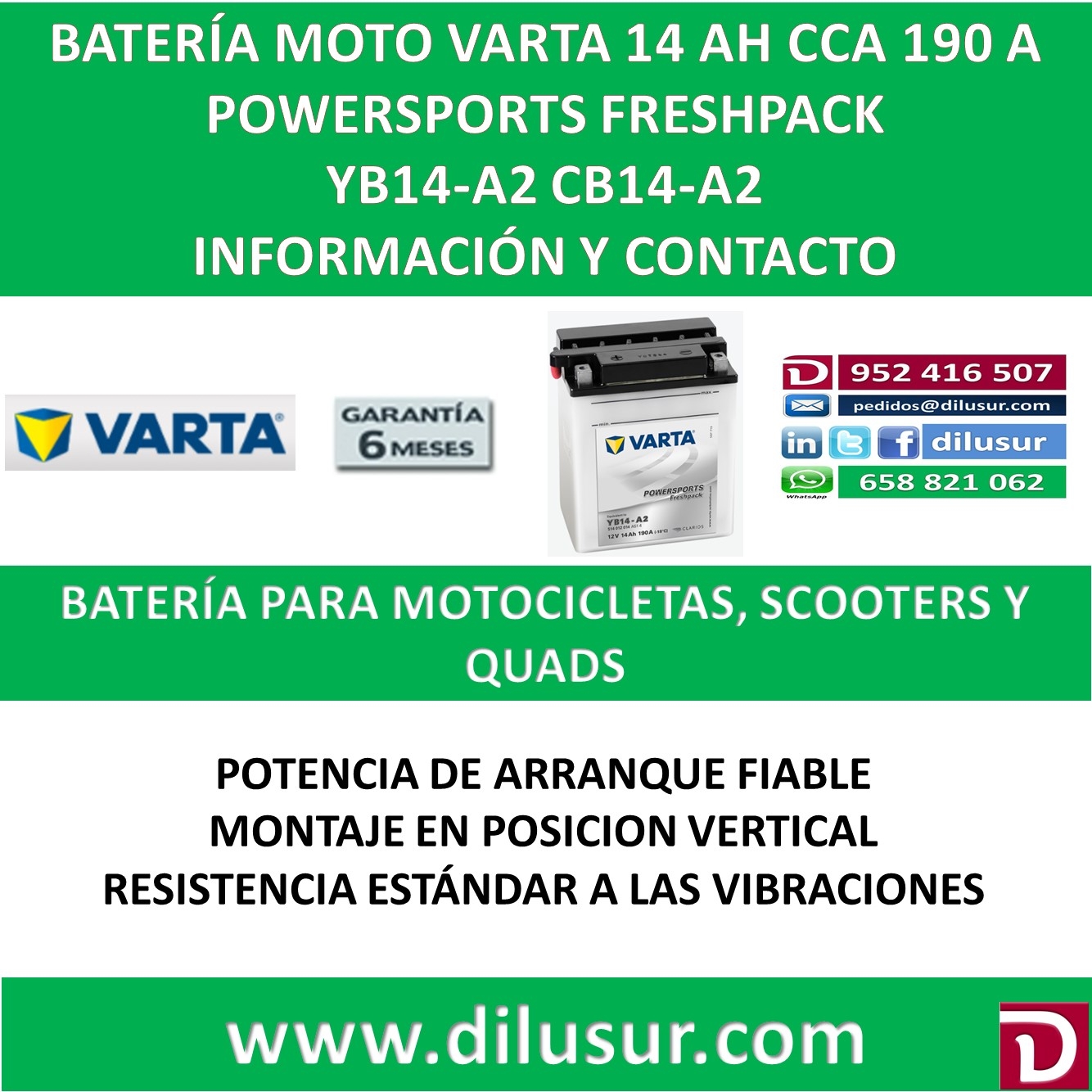 Para mas información sobre la bateria varta YB14-A2 , ver ficha tecnica adjunta