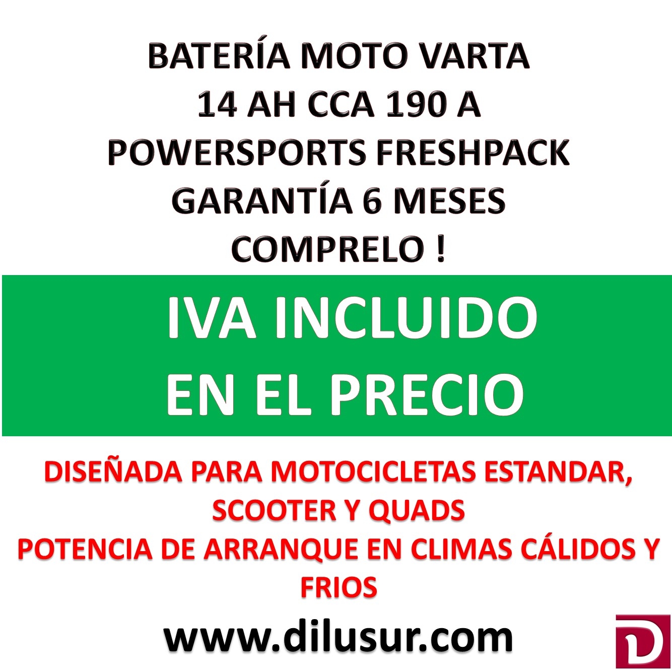 Ofertada al mejor precio del mercado para que el consumidor no tenga que acudir a otras marcas menos fiables. Diseñadas para motocicletas estándar, scooters y quads Se suministra completamente cargada y lista para usar Montaje en posicion vertical Potencia de arranque fiable en climas cálidos y frios Resistencia estandar a la vibración