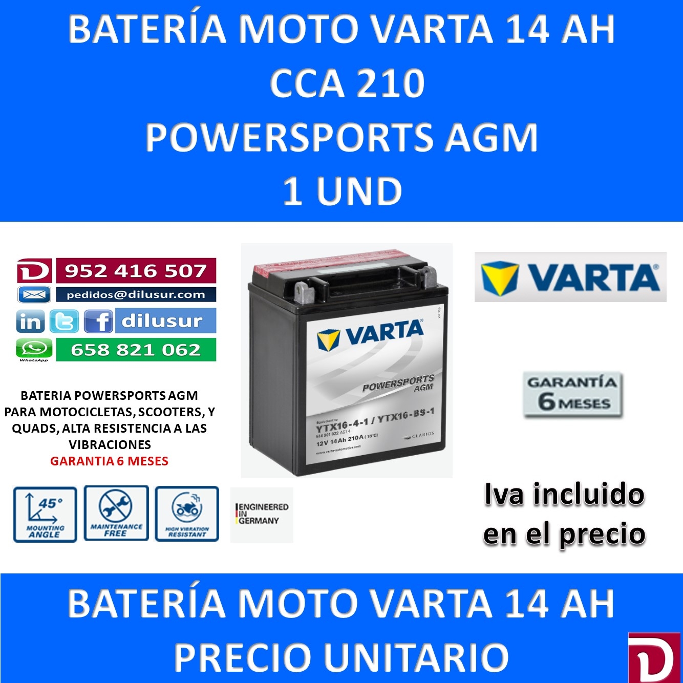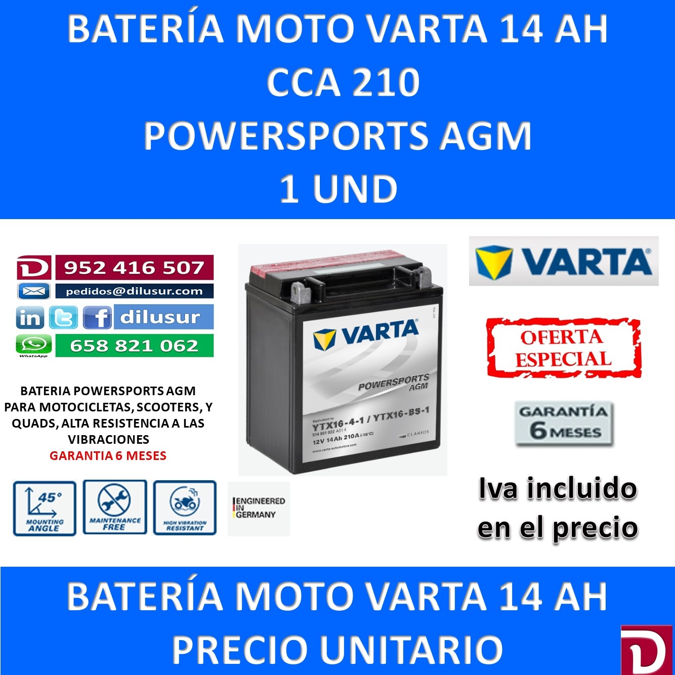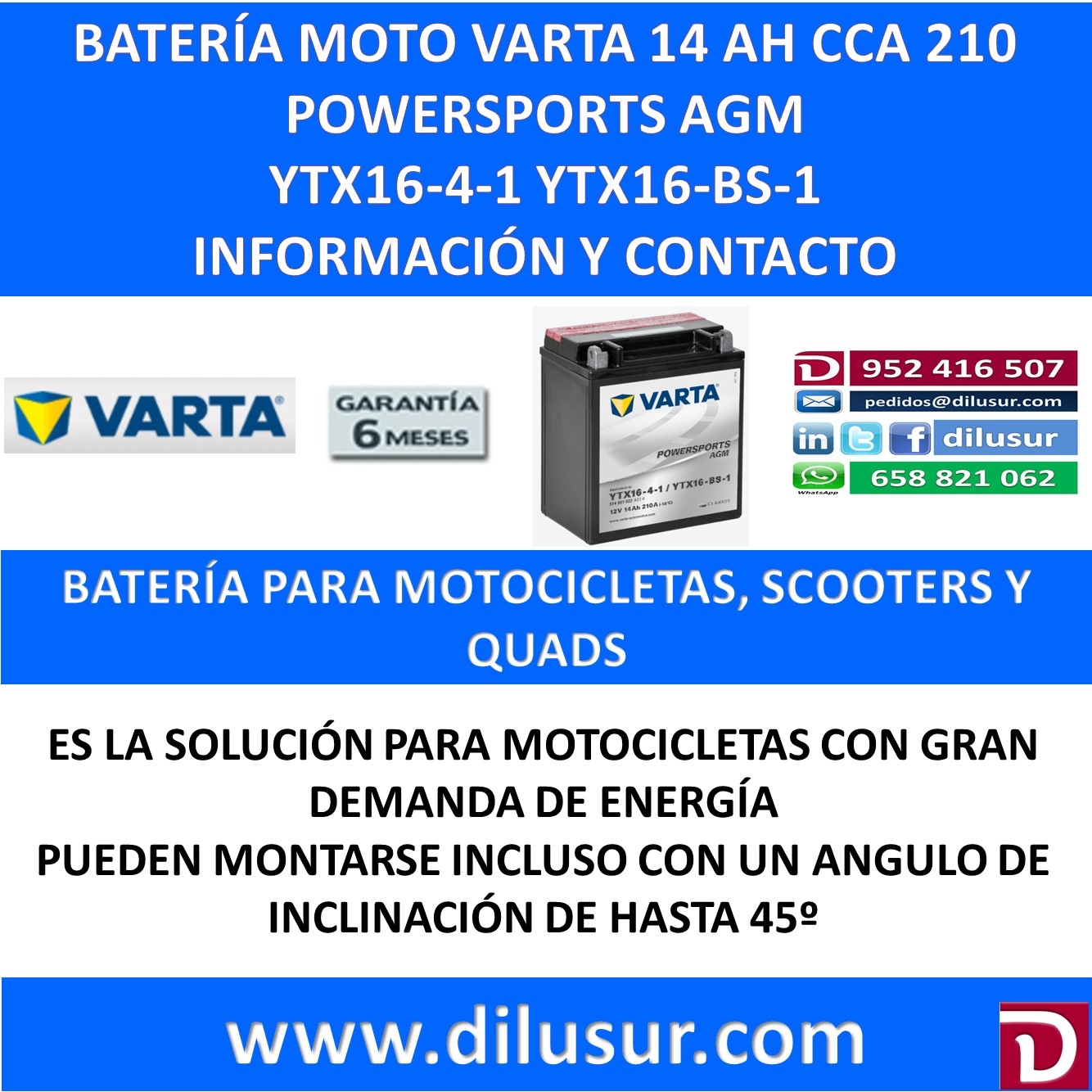 Para mas información sobre la bateria varta YTX16-BS-1 , ver ficha tecnica adjunta