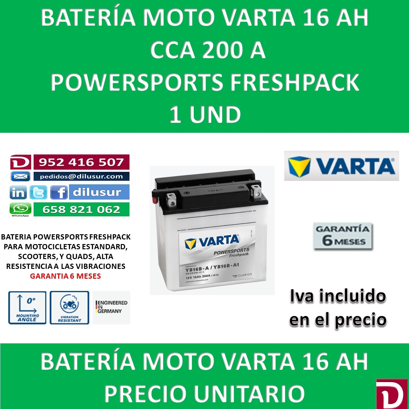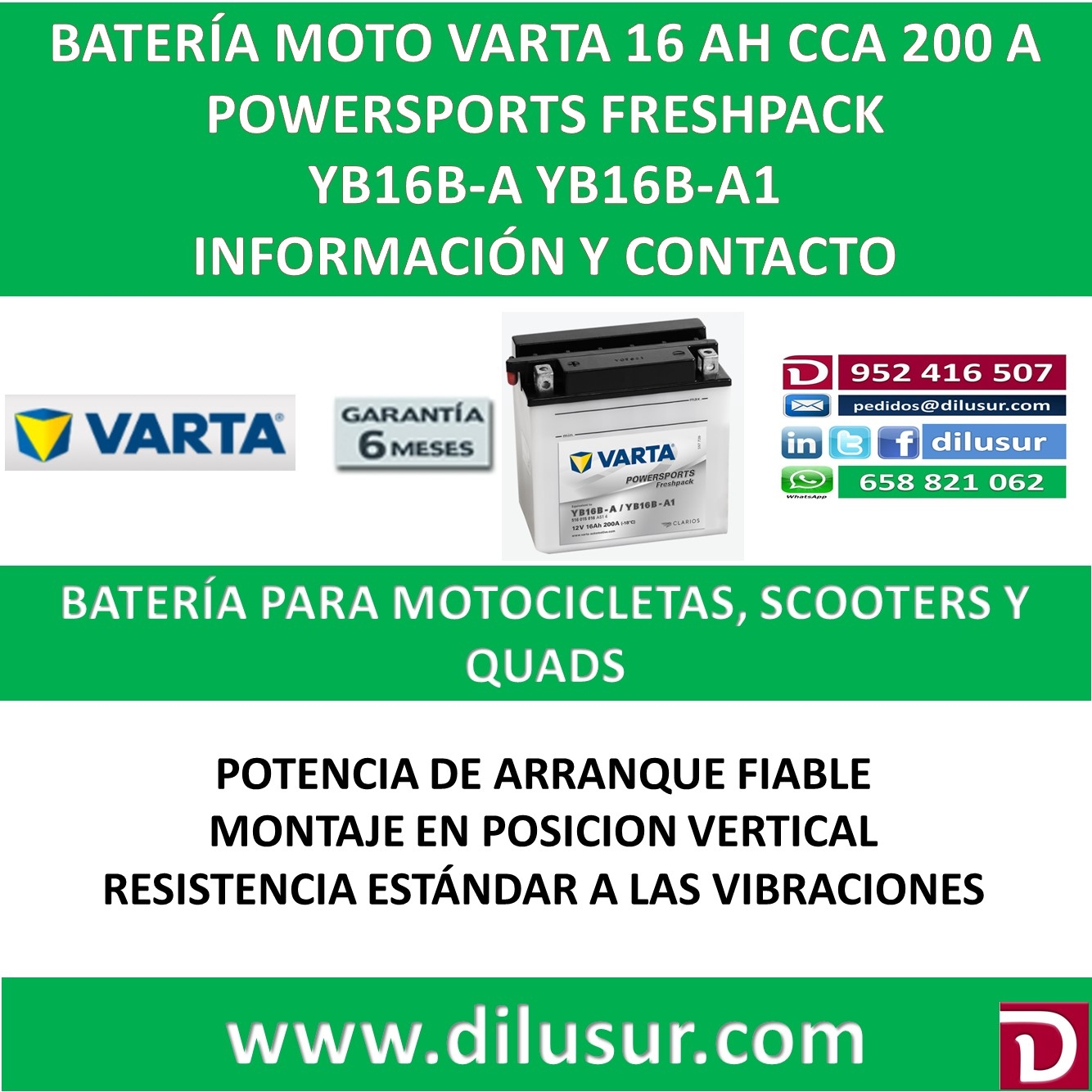 Para mas información sobre la bateria varta YB16B-A YB16B-A1 , ver ficha tecnica adjunta