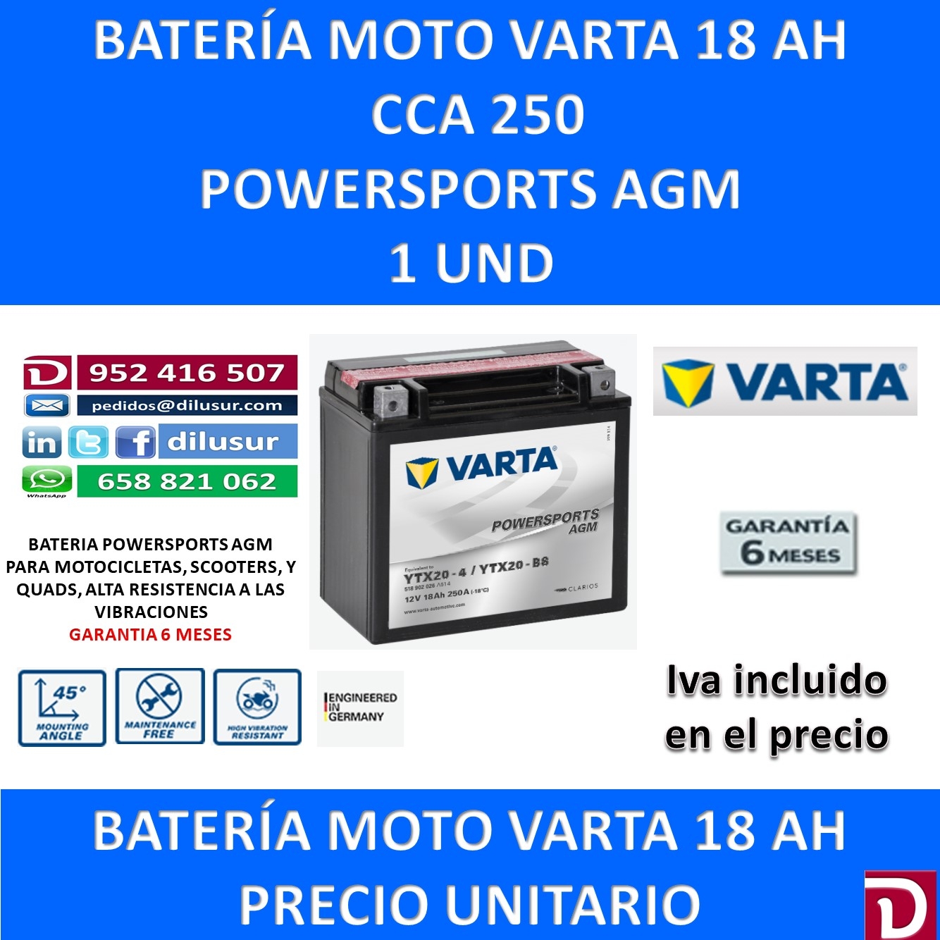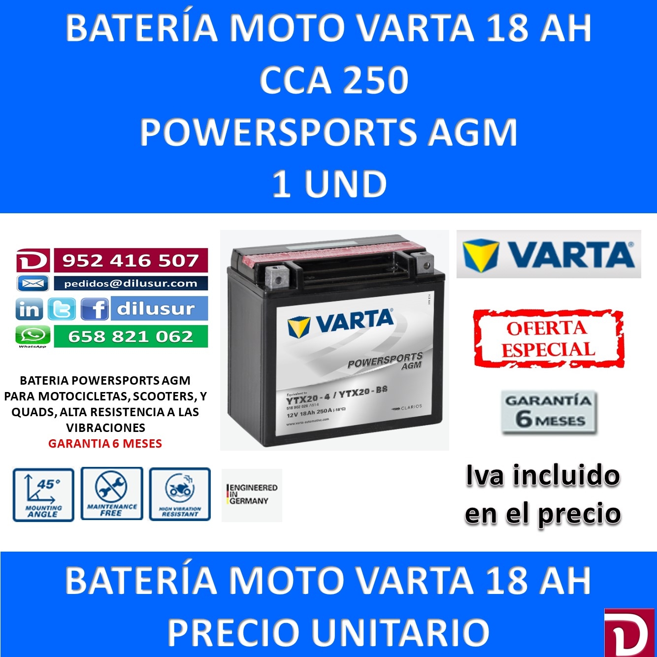 Batería Varta Moto 18 Ah CCA 250 A Ofertada al mejor precio del mercado para que el consumidor no tenga que acudir a otras marcas menos fiables. Batería con carga en seco en versión Freshpack (con recipiente de ácido) No requiere mantenimiento, no es necesario rellenarla Cumple la norma JLS A prueba de vuelcos y derrames en ángulos de hasta 45° Cuenta con la tecnología AGM (Absorbent Glass Mat), lo que hace que la batería se pueda cargar y descargar una y otra vez sin que ello afecte al rendimiento.