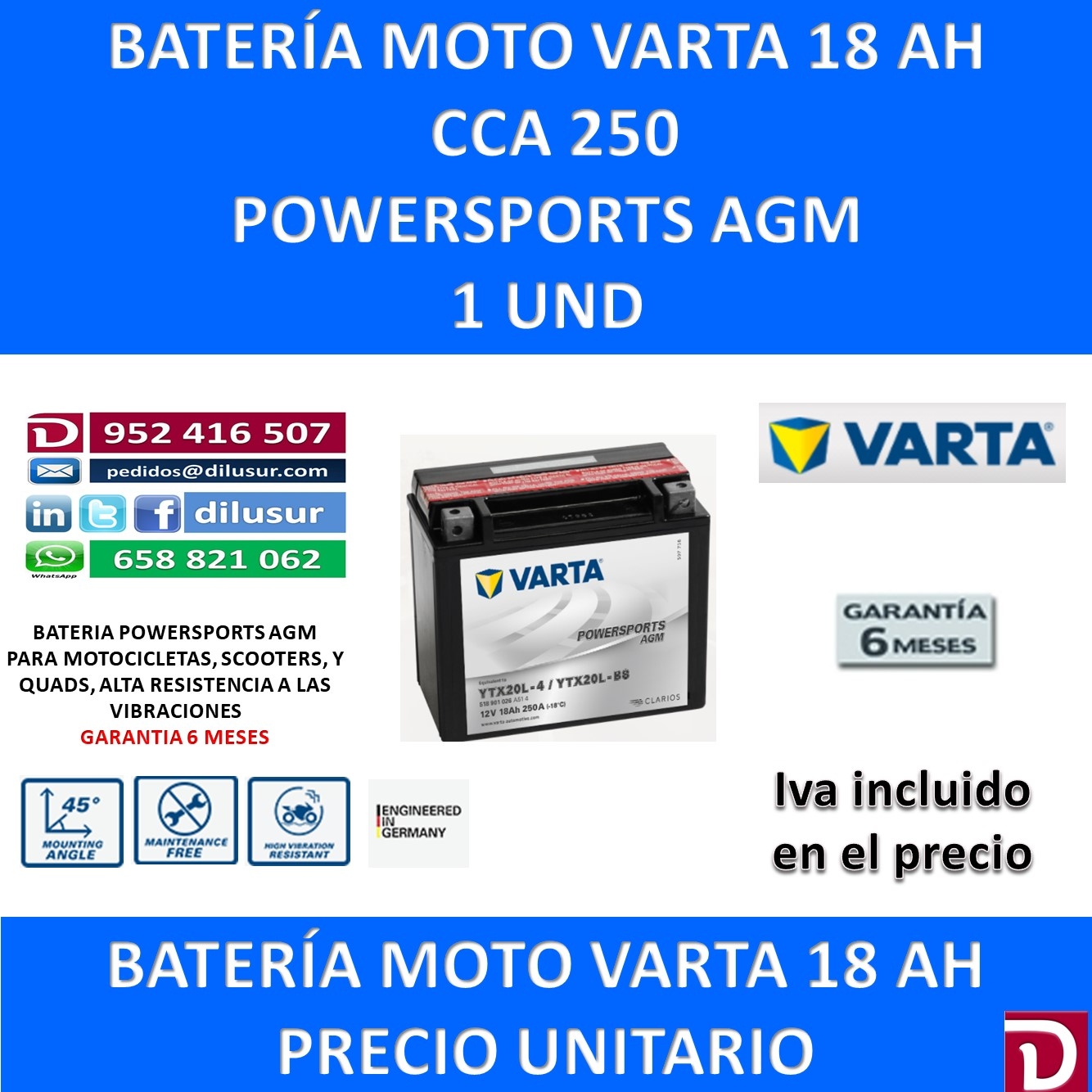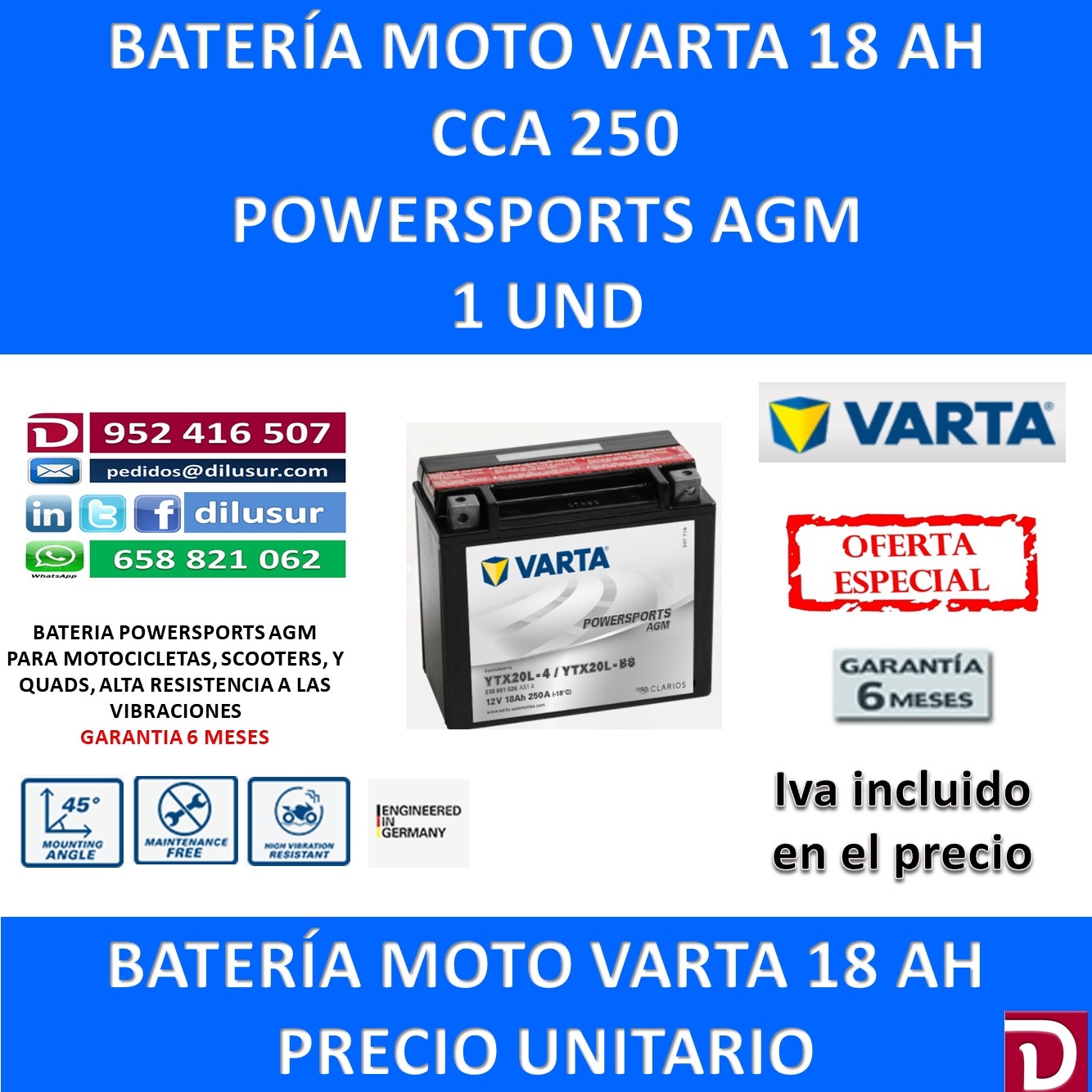 Batería Varta Moto 18 Ah CCA 250 A Ofertada al mejor precio del mercado para que el consumidor no tenga que acudir a otras marcas menos fiables. Batería con carga en seco en versión Freshpack (con recipiente de ácido) No requiere mantenimiento, no es necesario rellenarla Cumple la norma JLS A prueba de vuelcos y derrames en ángulos de hasta 45° Cuenta con la tecnología AGM (Absorbent Glass Mat), lo que hace que la batería se pueda cargar y descargar una y otra vez sin que ello afecte al rendimiento.