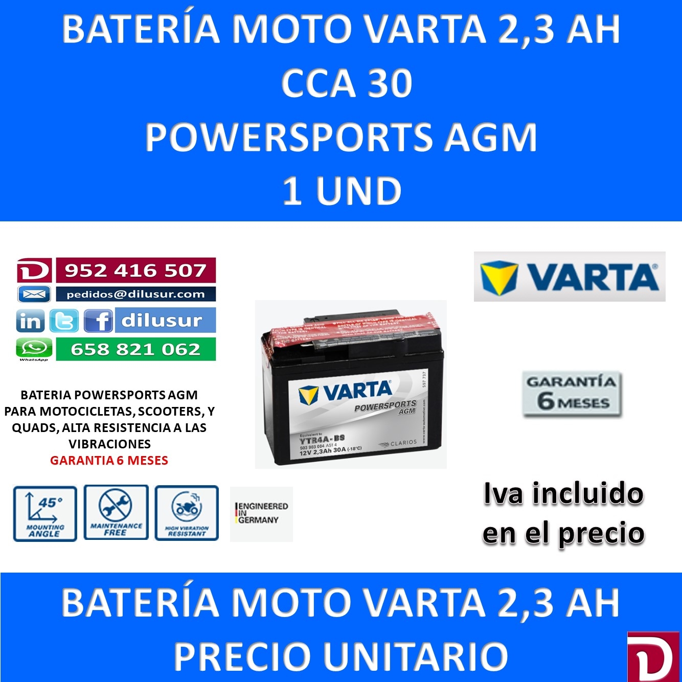 Batería Varta Moto 2,3 Ah CCA 30 A Ofertada al mejor precio del mercado para que el consumidor no tenga que acudir a otras marcas menos fiables. Batería con carga en seco en versión Freshpack (con recipiente de ácido) No requiere mantenimiento, no es necesario rellenarla Cumple la norma JLS A prueba de vuelcos y derrames en ángulos de hasta 45° Cuenta con la tecnología AGM (Absorbent Glass Mat), lo que hace que la batería se pueda cargar y descargar una y otra vez sin que ello afecte al rendimiento.