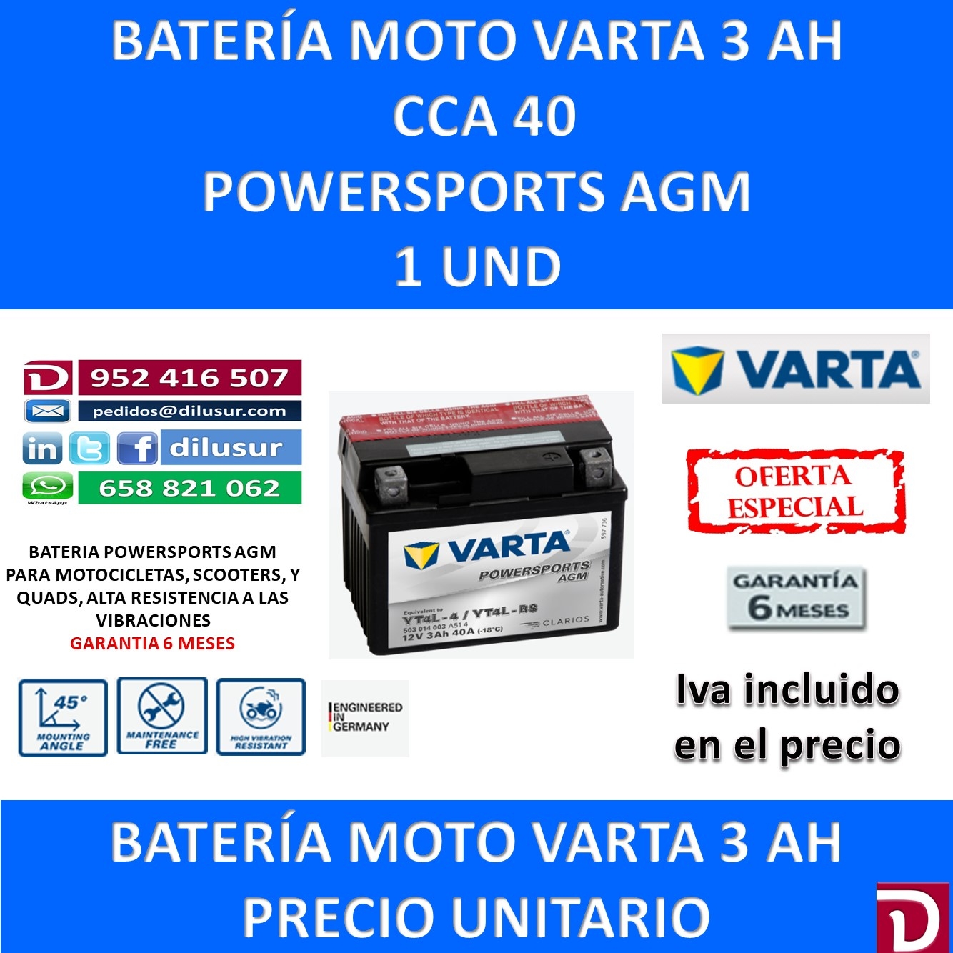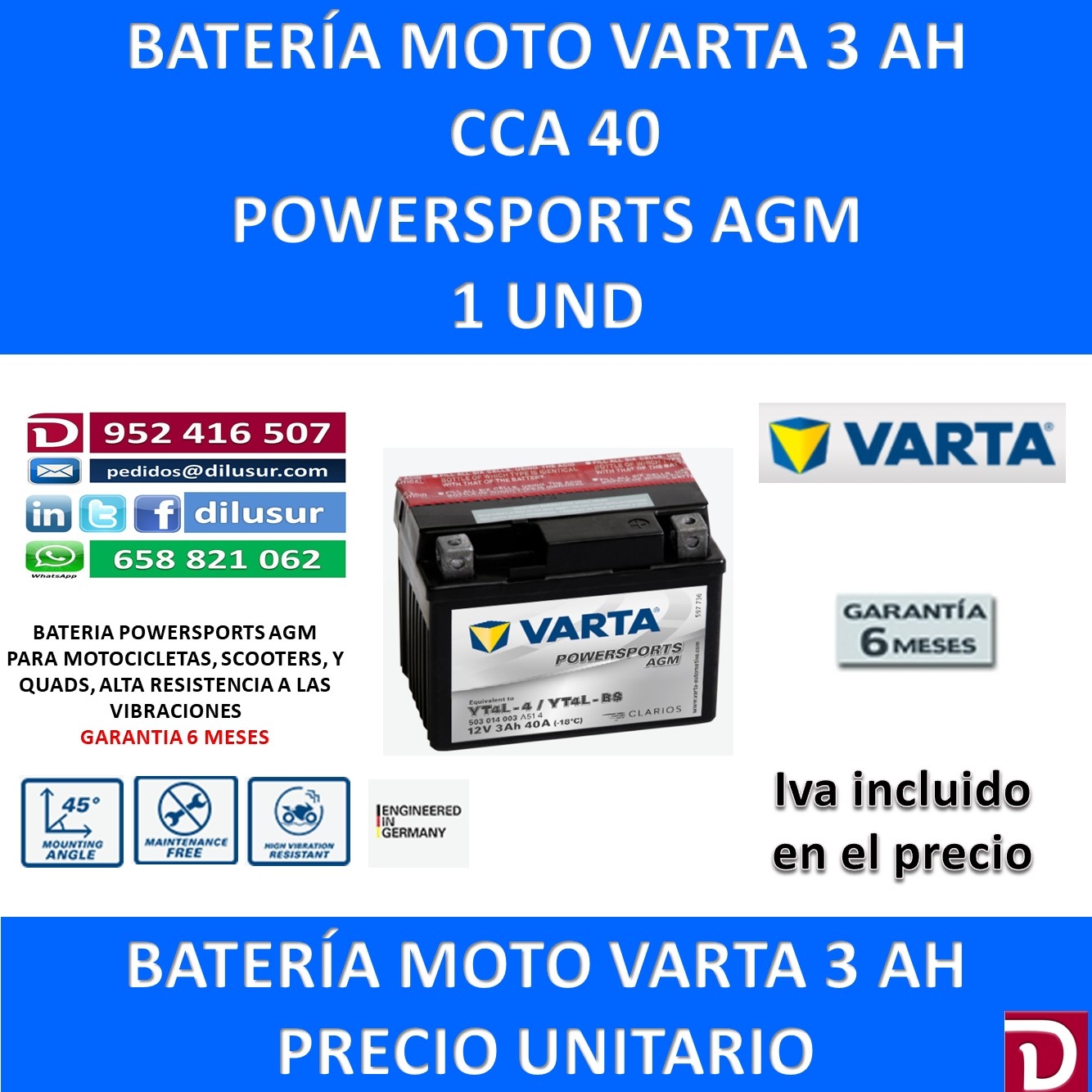 Para mas información sobre la bateria varta YT4L-BS, ver ficha tecnica adjunta