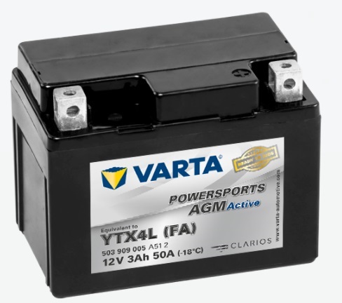 Batería de arranque Moto 3 Ah, YTX4L(FA) AGM ACTIVE, para motocicletas con exigencias de potencia adicionales. Largo 113 mm, ancho 70 mm, alto 87 mm. Positivo derecha. Iva incluido.