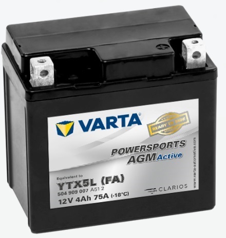 Batería de arranque Moto 4 Ah, YTX5L(FA) AGM ACTIVE, para motocicletas con exigencias de potencia adicionales. Largo 113 mm, ancho 70 mm, alto 105 mm. Positivo derecha. Iva incluido.