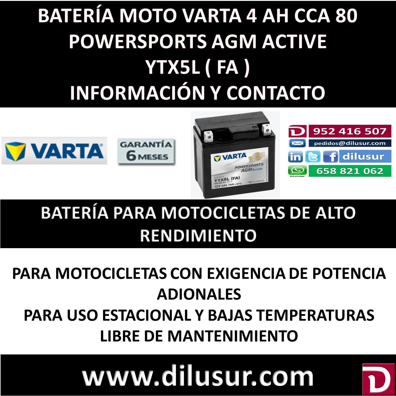 Para mas información sobre la bateria varta YTX5L ( FA ) , ver ficha tecnica adjunta