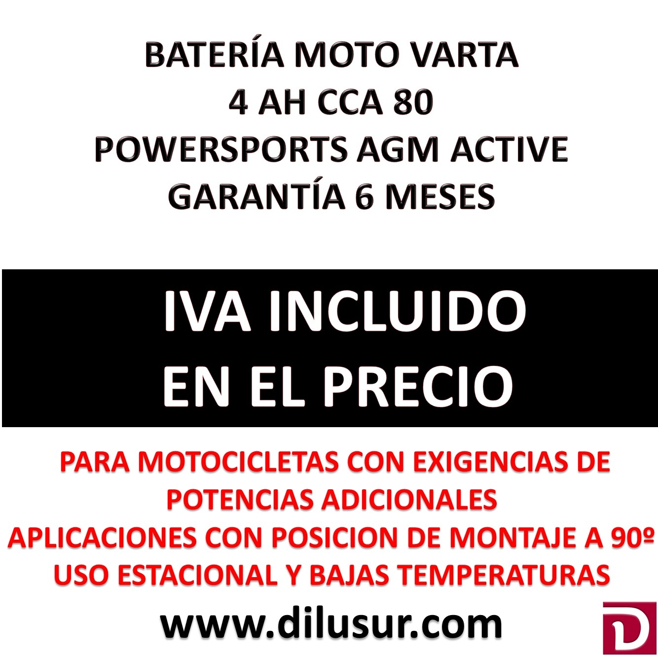 Ofertada al mejor precio del mercado para que el consumidor no tenga que acudir a otras marcas menos fiables. AGM activada de fábrica lista para rodar Cargada y llenada con precisión, sellada de forma permantente Sin derrames, 100% libre de mantenimiento Mayor vida útil Mayor resistencia a las vibraciones Sin restricciones para el ángulo de montaje Muy resistente a las vibraciones Baja autodescarga Para motocicletas con exigencia de potencia adicionales Necesidad de potencia adicionales de accesorios ( puños calefactables,sistemas de seguridad,etc) Aplicaciones con posicion de montaje a 90º Para uso estacional y bajas temperaturas
