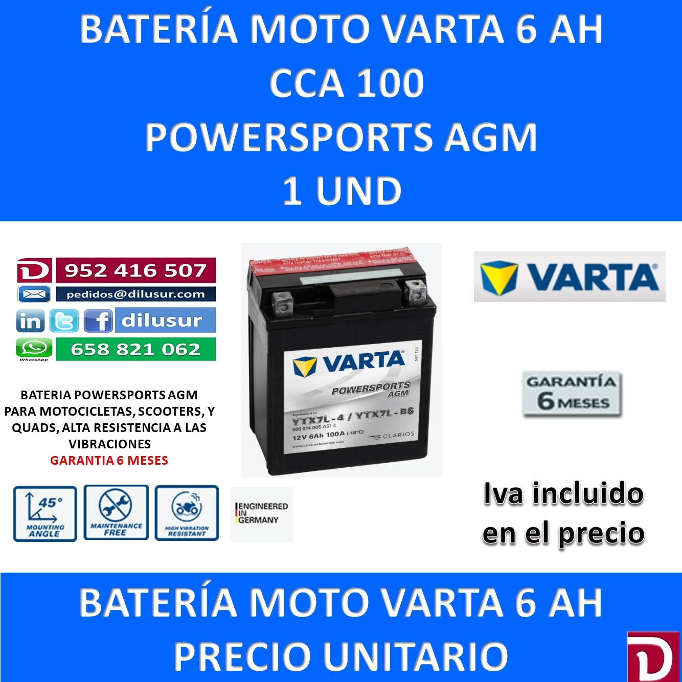Batería Varta Moto 6 Ah CCA 100 A Ofertada al mejor precio del mercado para que el consumidor no tenga que acudir a otras marcas menos fiables. Batería con carga en seco en versión Freshpack (con recipiente de ácido) No requiere mantenimiento, no es necesario rellenarla Cumple la norma JLS A prueba de vuelcos y derrames en ángulos de hasta 45° Cuenta con la tecnología AGM (Absorbent Glass Mat), lo que hace que la batería se pueda cargar y descargar una y otra vez sin que ello afecte al rendimiento.