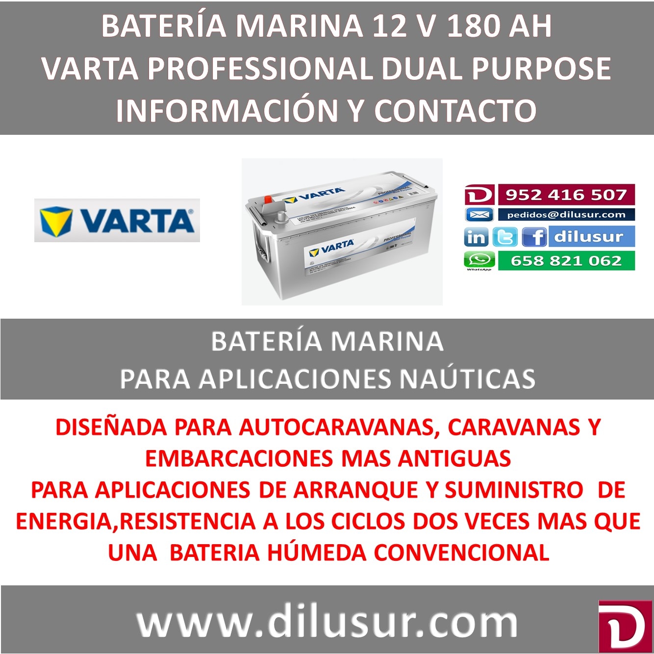 Bateria marina Varta Professional Dual Purpose 180 ah CCA 1000, para autocaravanas, caravanas y embarcaciones mas antiguas. De doble uso arranque y demanda de energia. Medidas largo 513 mm, ancho 223 mm y alto 223 mm. Bornas Esquema 3. Iva incluido