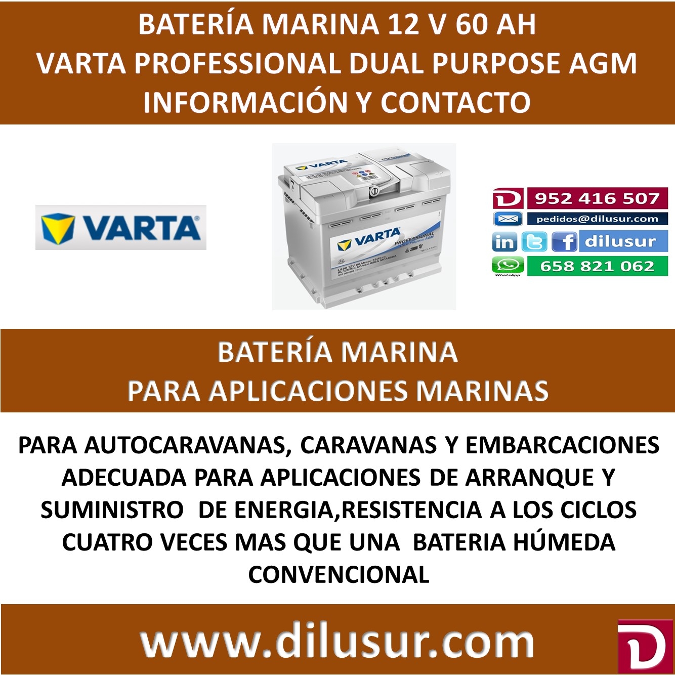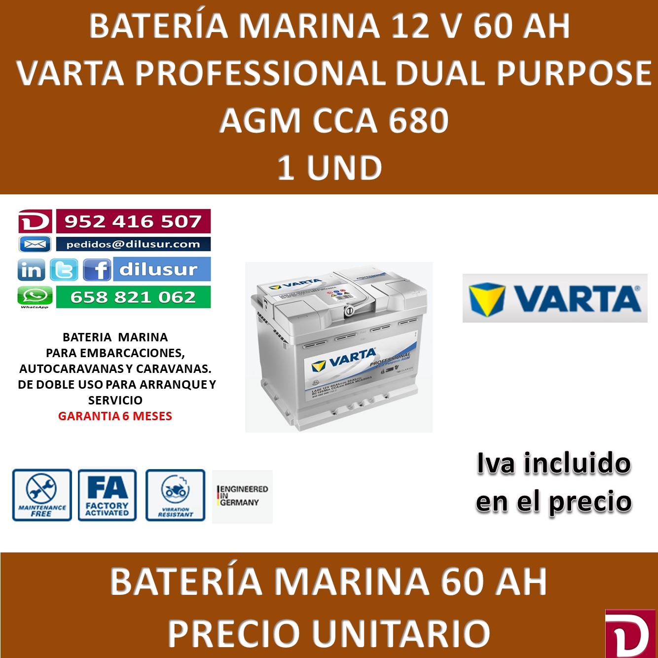 Bateria marina Varta Professional Dual Purpose AGM 60 AH CCA 680, para arranque de motor y suministro de energia en autocaravanas, caravanas y embarcaciones. Medidas largo 518 mm, ancho 276 mm y alto 242 mm. Positivo derecha. Iva incluido