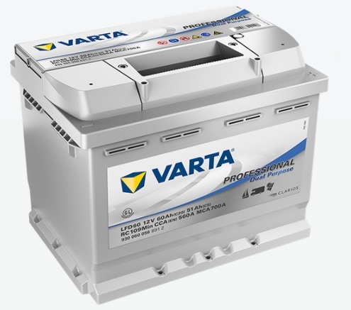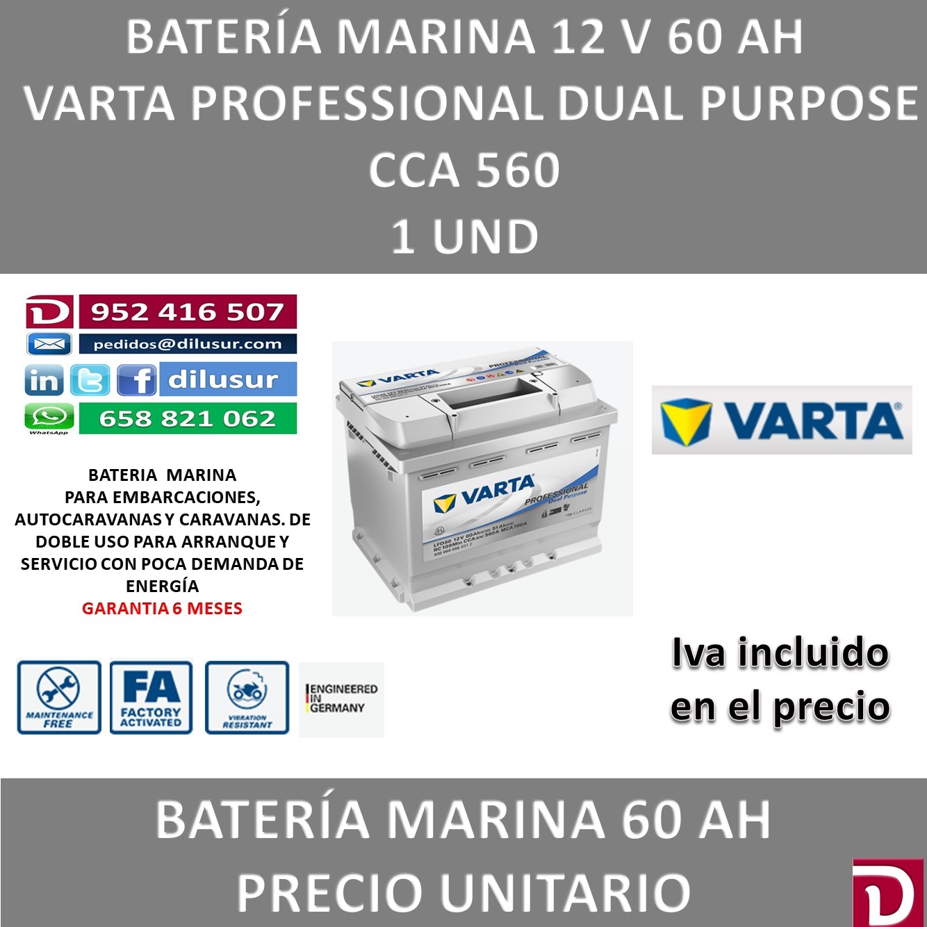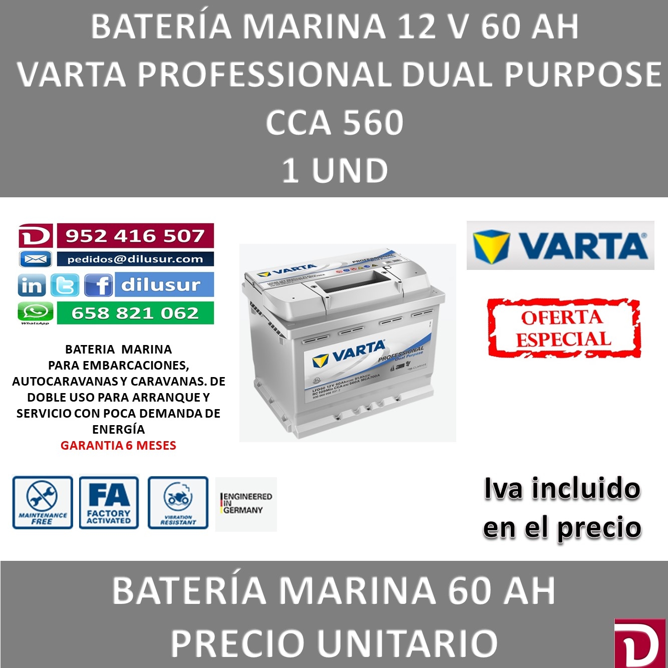 Bateria marina Varta Professional Dual Purpose 60 ah CCA 560, para autocaravanas, caravanas y embarcaciones mas antiguas. De doble uso arranque y demanda de energia. Medidas largo 330 mm, ancho 175 mm y alto 240 mm. positivo izquierda. Iva incluido