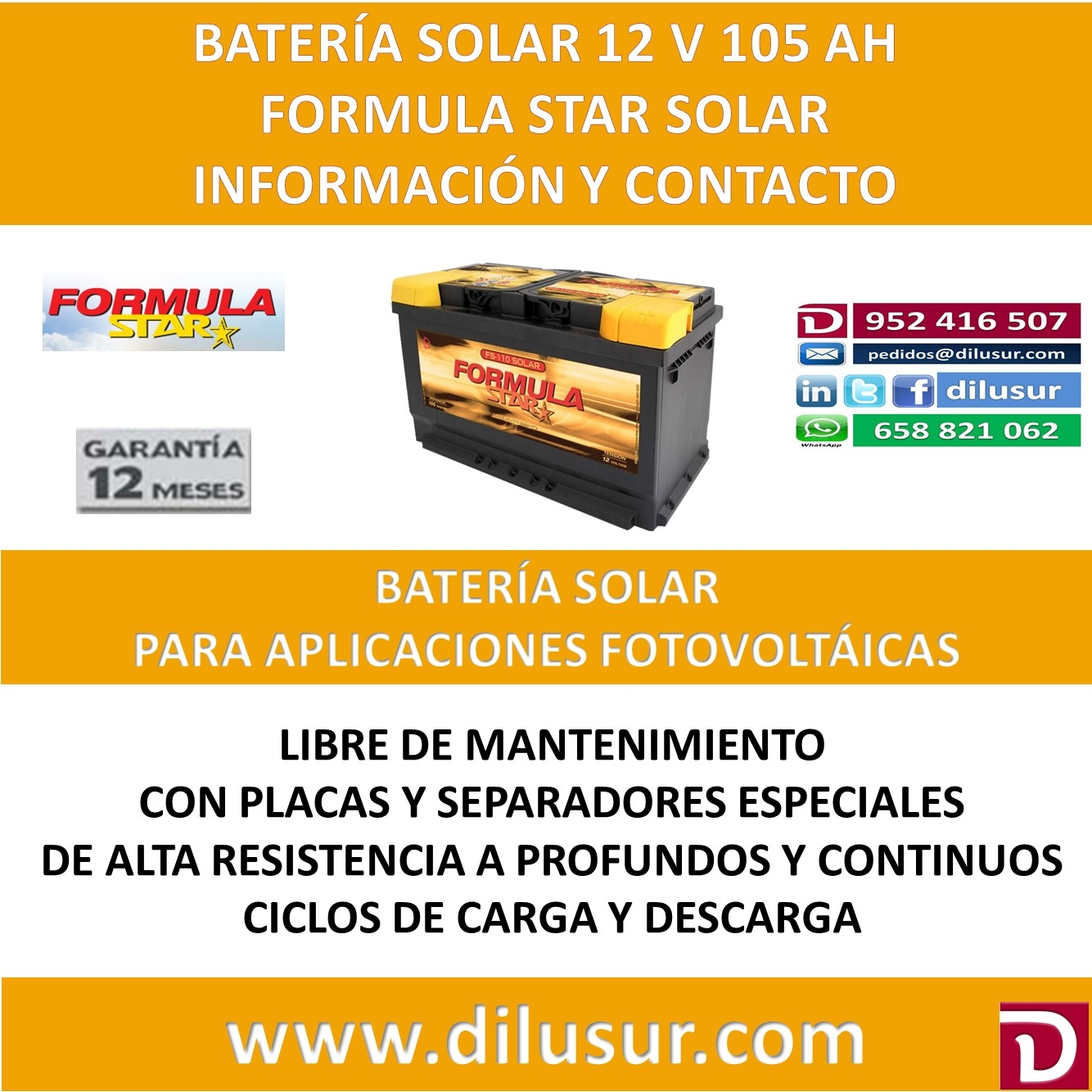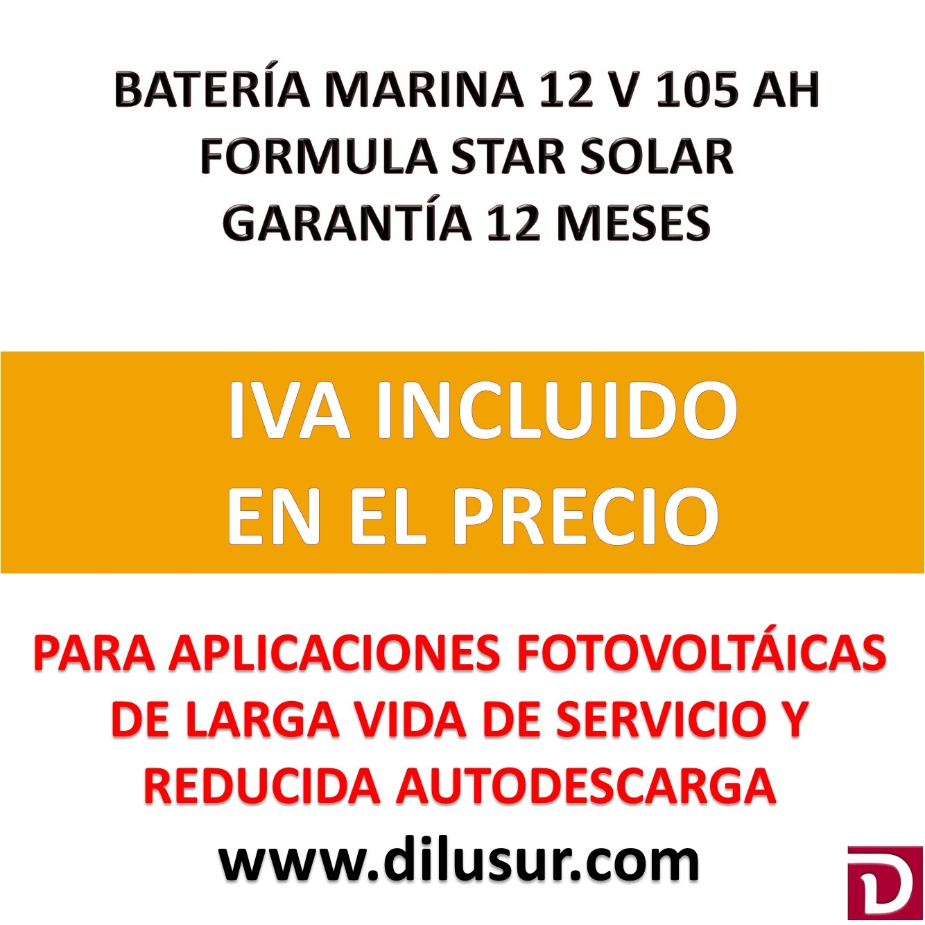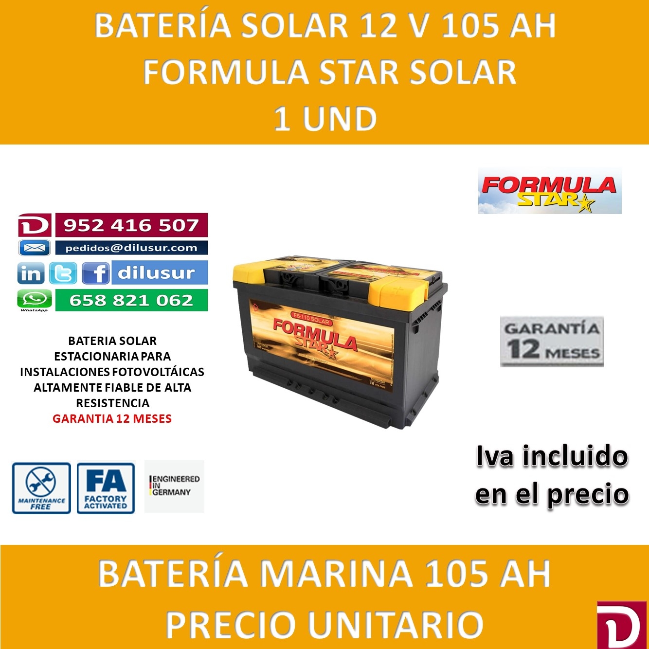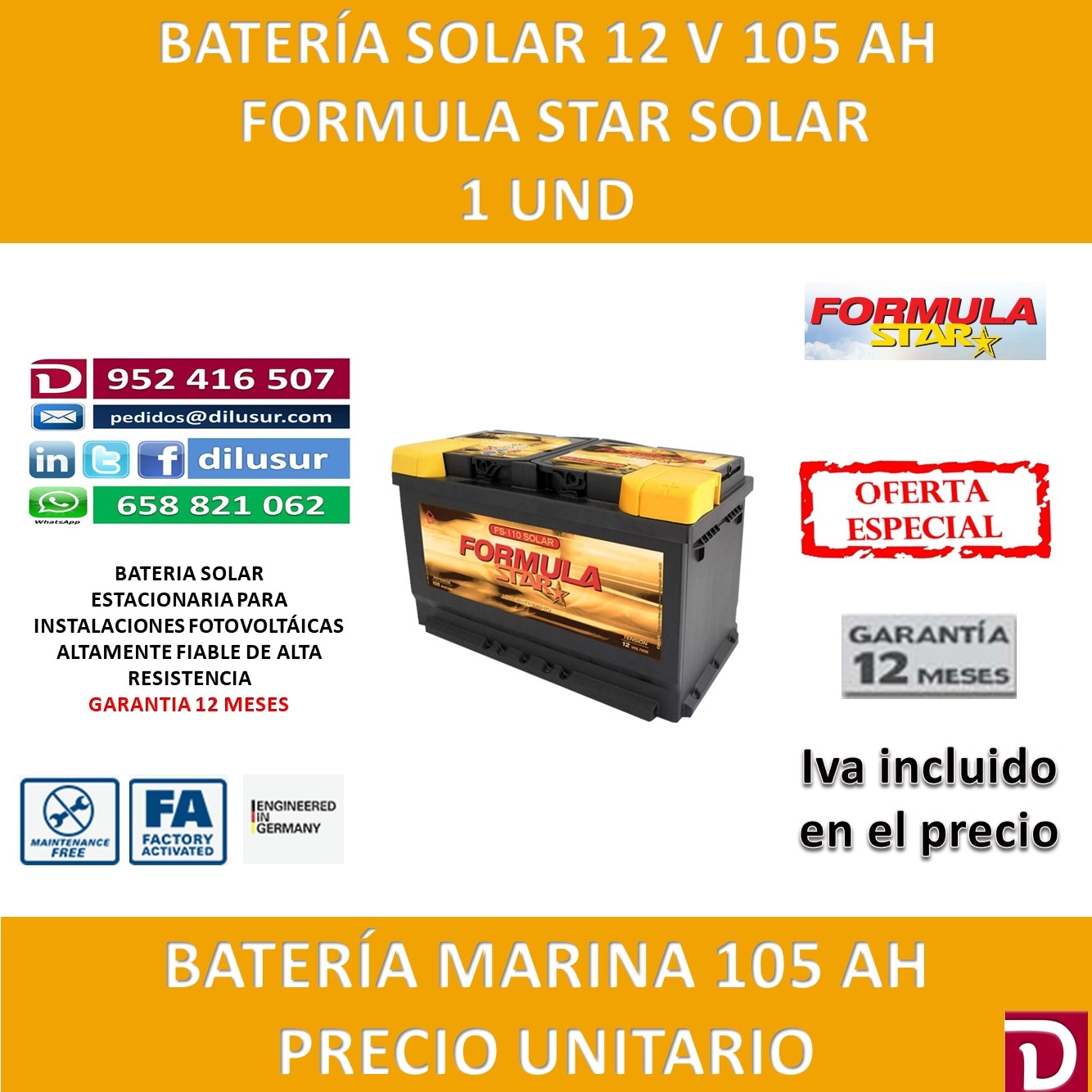 Bateria Solar Formula Star 105 AH, es una bateria hermetica estacionaria para instalaciones fotovoltáicas de pequeño tamaño. Medidas largo 353 mm, ancho 175 mm y alto 190 mm. Positivo derecha. Iva incluido en el precio