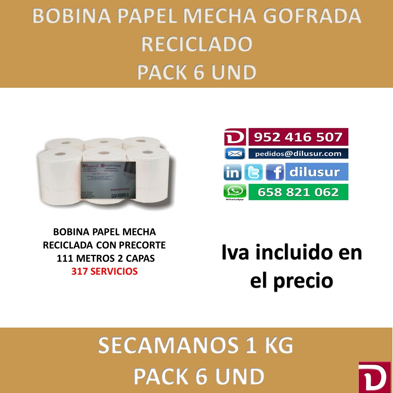 Bobina de papel mecha de textura gofrada, color blanco, reciclada de doble capa, alta absorcion para usos múltiples. Se presenta en pack de 6 unds de 1 kg. Iva incluido en el precio