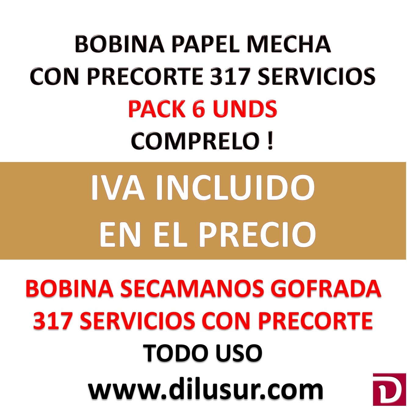Bobina de 111 mts y precorte 317 servicios. Medidas: ancho 21.5 cm., exterior 19 cm e interior 7,2 cm.