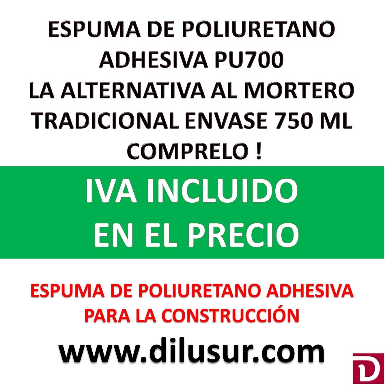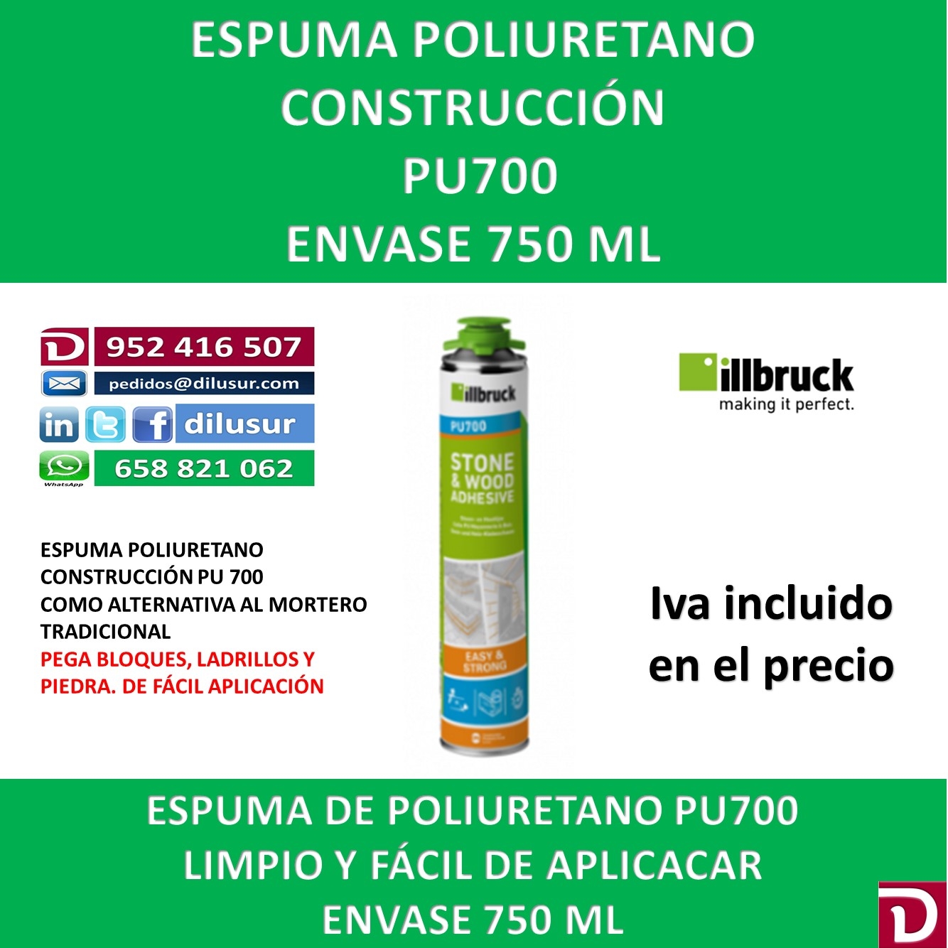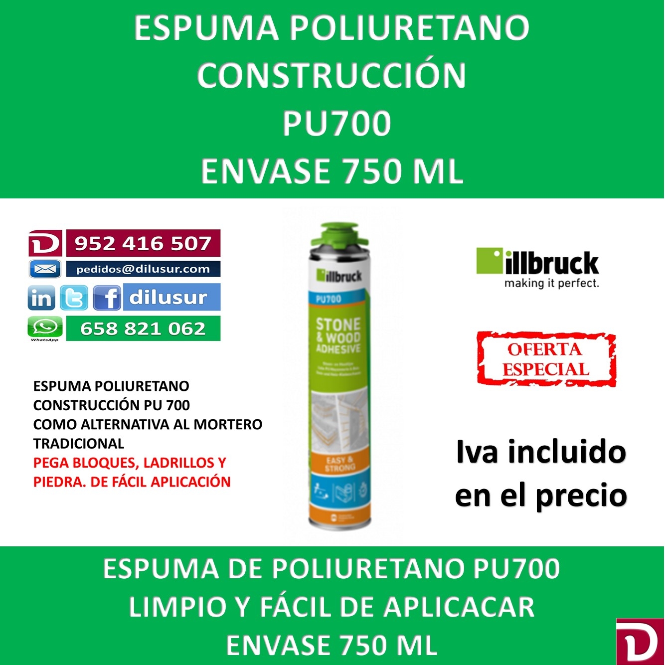 Espuma de poliuretano PU700, adecuada como alternativa al mortero tradicional de curado rápido. Para el pegado de ladrillos, piedras y bloques como alternativa al mortero tradicional. Envase 750 ml, caja 12 unds. IVA incluido