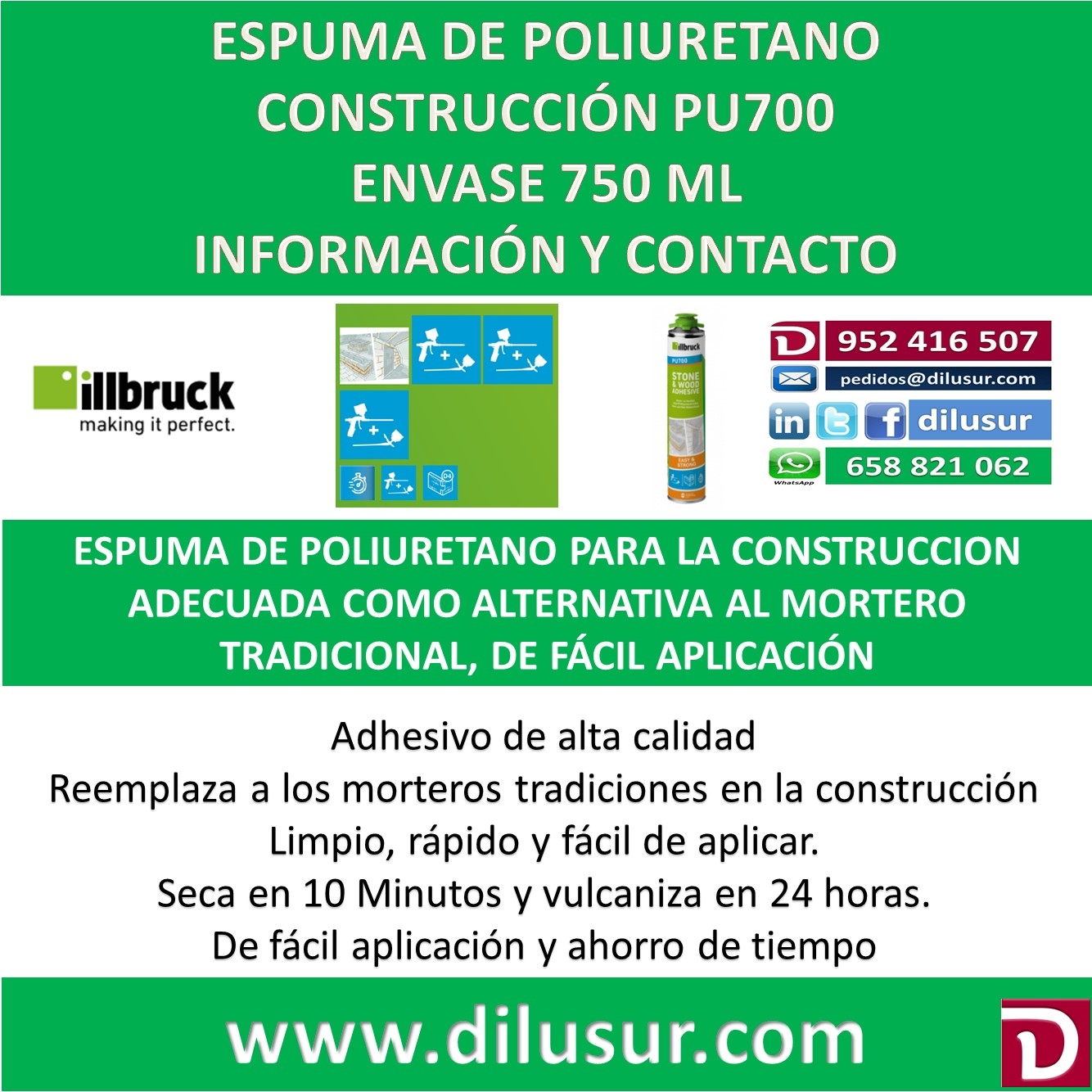 Para el pegado de ladrillos, piedras, bloques y una gran varidad de materiales de contrucción como alternativa real a mortero tradicional. Limpio, rápido y fácil de aplicar Seca en 10 minutos y vulcaniza en 24 hrs. Excelente resistencia a largo plazo a la intemperie, agua, agua de mar, ácidos y disolventes. IVA incluido en el precio