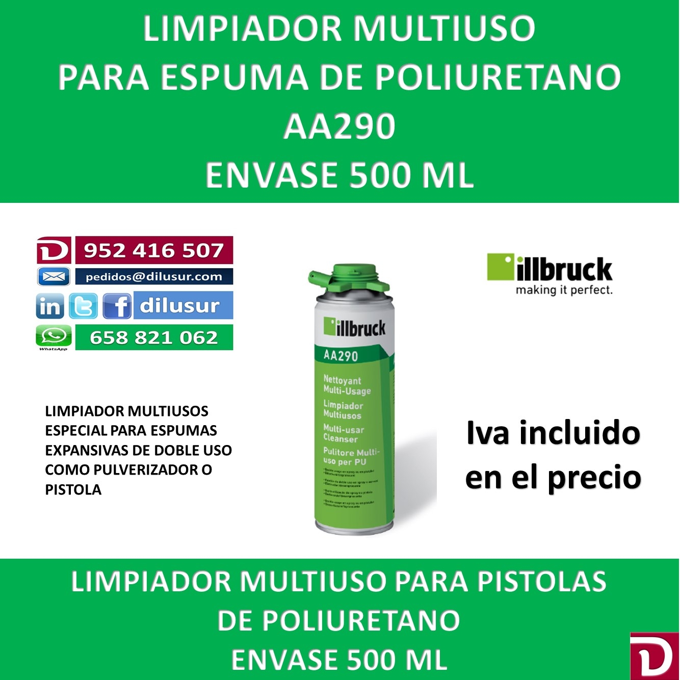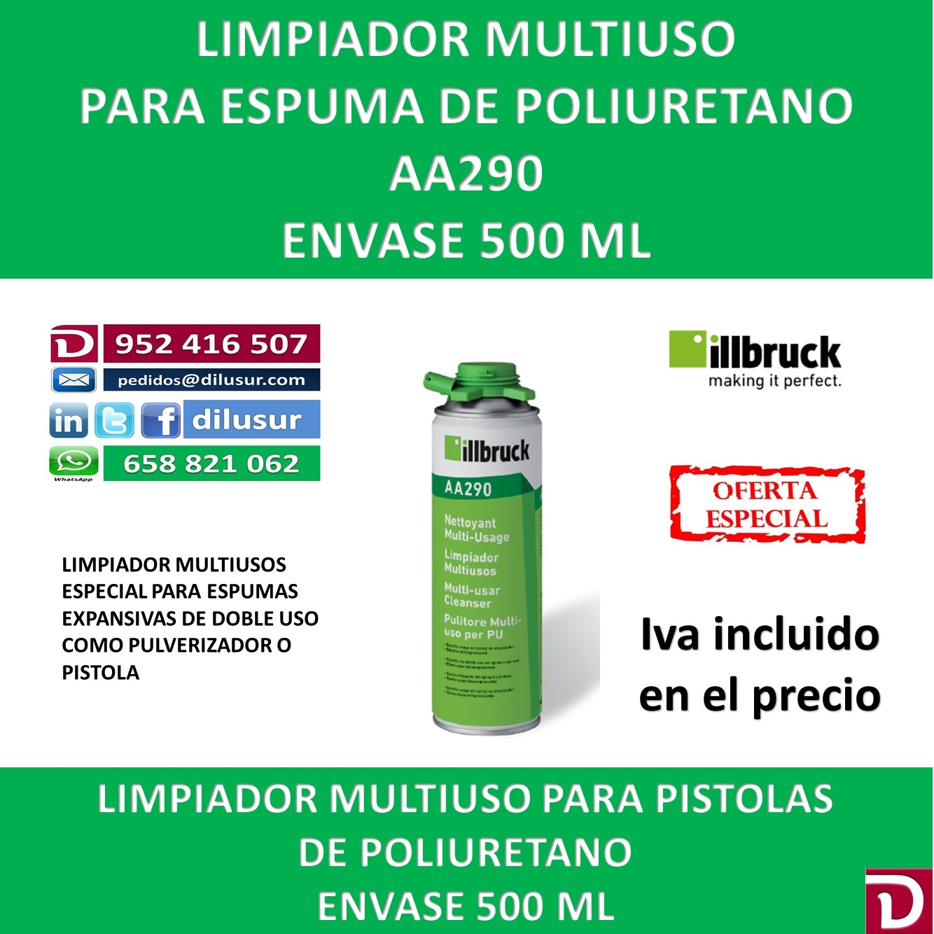 Limpiador multiusos AA290, permite limpiar las pistolas para espumas expansivas. así como sus adaptadores. Envase 500 ml. IVA incluido