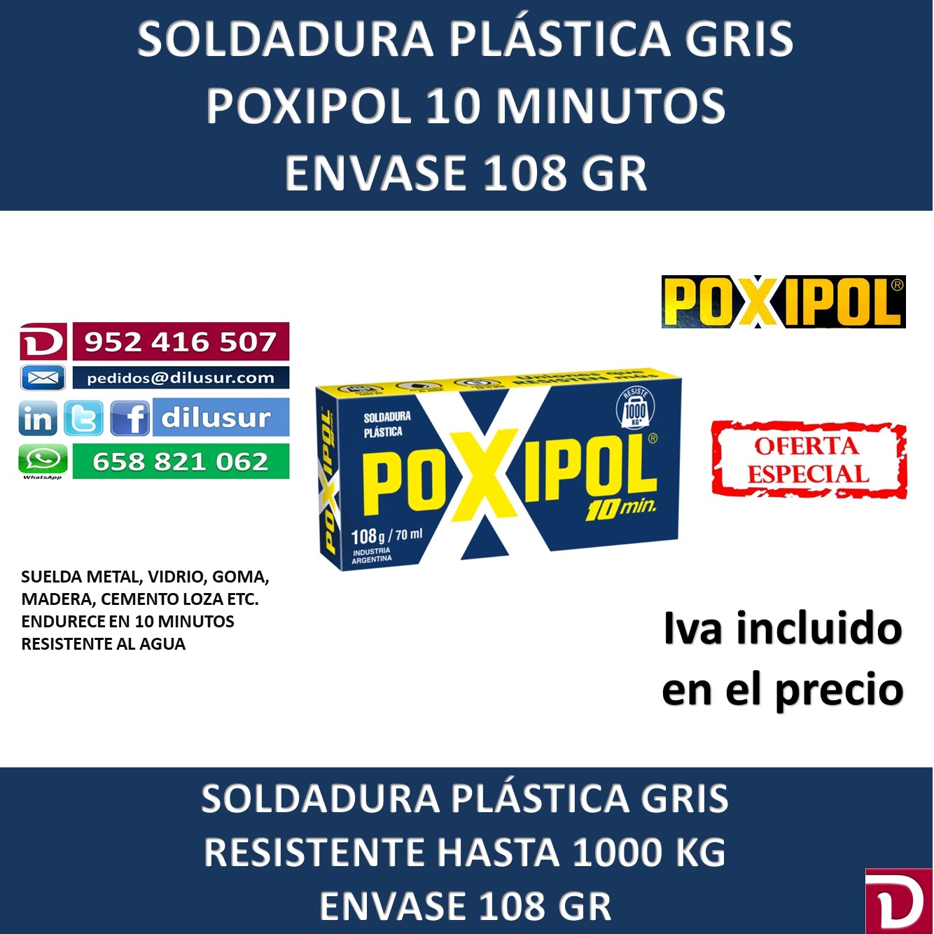Pegamento bicomponente poxipol gris, resitente hasta 1000 kg, resistente al agua y endurece en 10 minutos. Para reparar, fijar, construir y sellar. Para todo tipo de superficies. Precio unitario. Envase 108gr/70 ml. IVA incluido