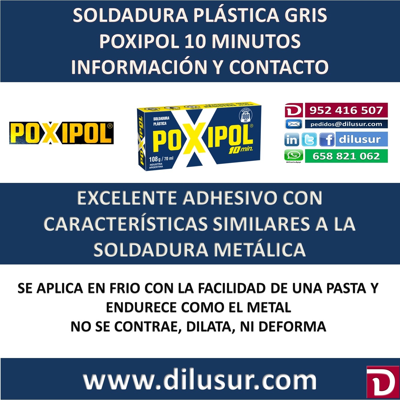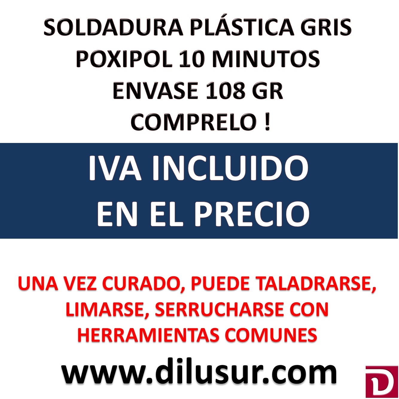 Pegamento bicomponente de color gris Resistente hasta 1000 kg ( sobre hierro arenado, 3 x 3 cm 23ºC) Resistente al agua Endurece en 10 minutos Repara automoviles, muebles, juguetes, art deportivos, etc Fija ganchos y soportes en paredes, mangos de herramientas, etc. Sella goteras en cañerias, metales, tanques de agua, aceite, etc Excelente adhesivo con caracteristicas similares a la soldadura metálica Se aplica en frio con la facilidad de una pasta y endurece como el metal No escurre ni siquiera en superficies verticales Una vez curado, puede taladrarse, lijarse y cortarse Resistente a temperaturas de hasta 120º C dependiendo de la aplicacion