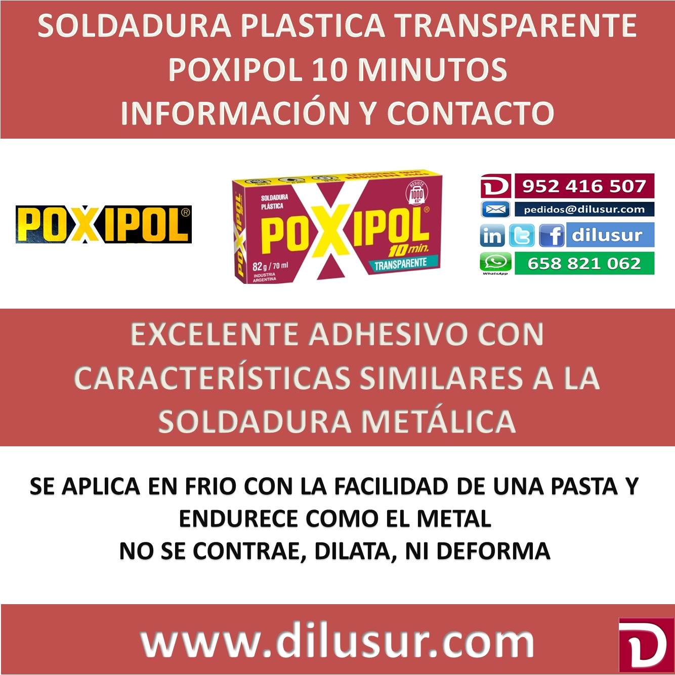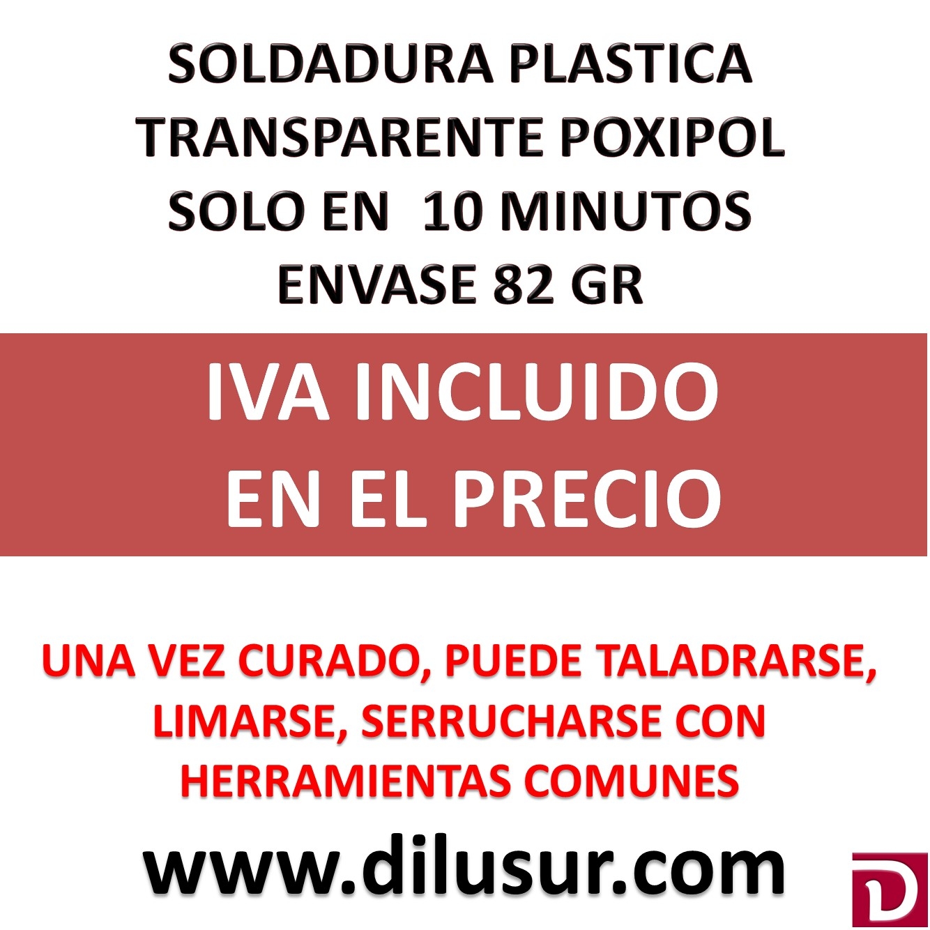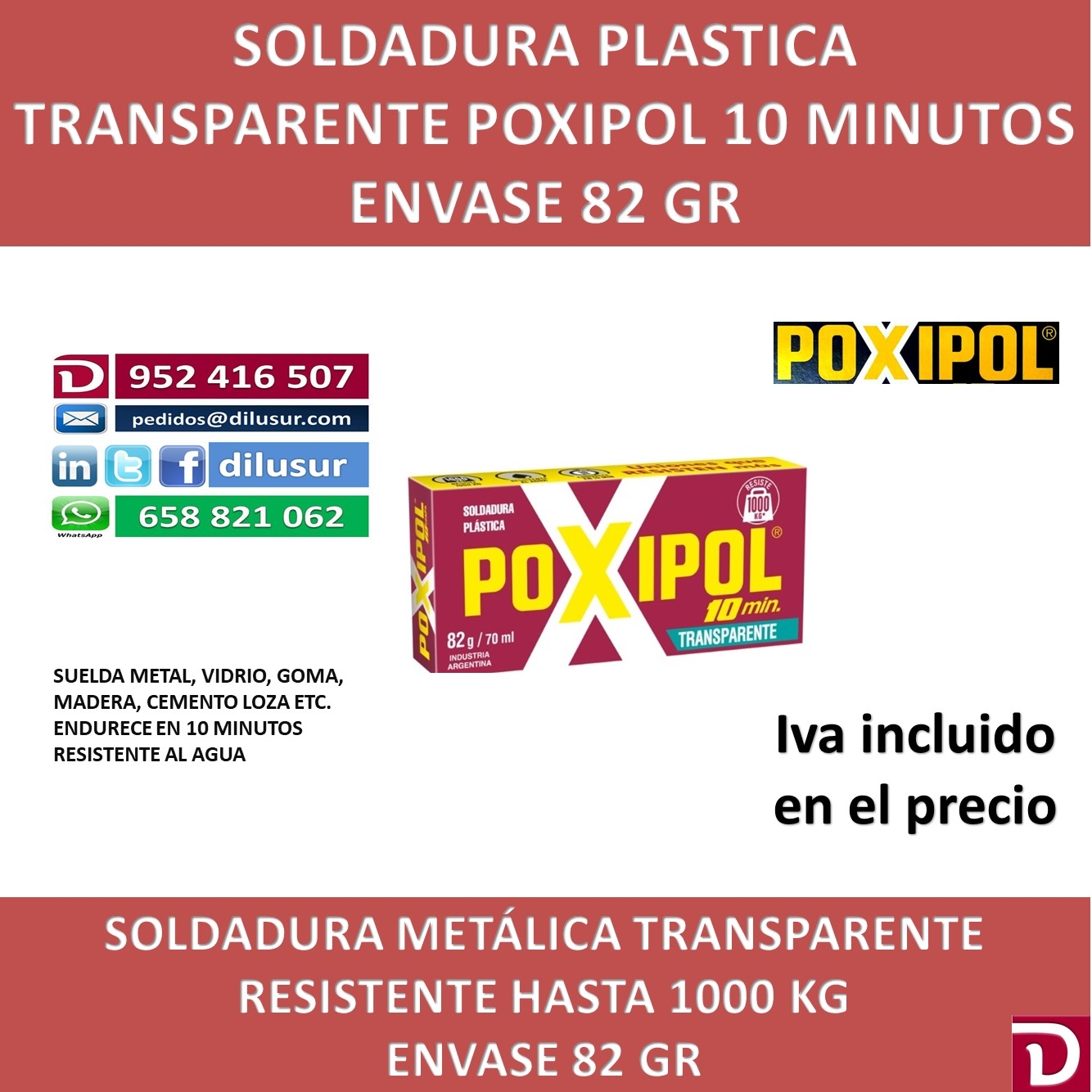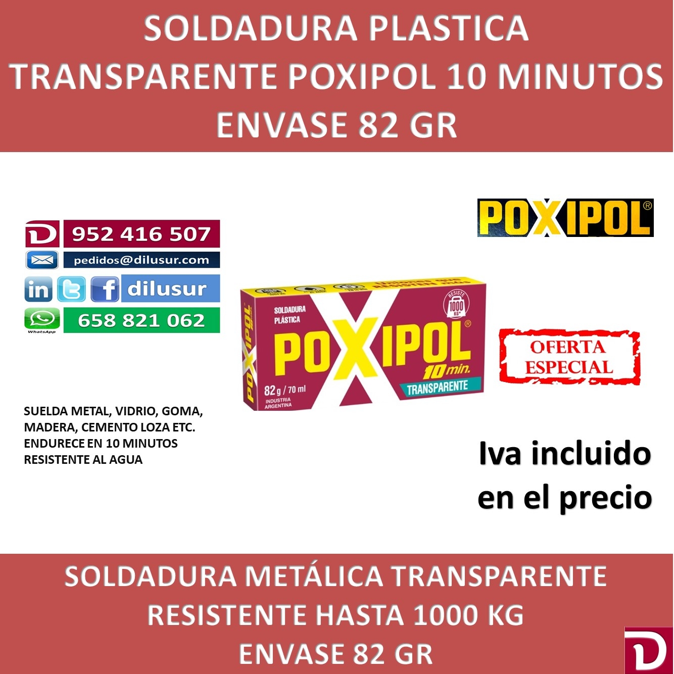 Pegamento bicomponente poxipol transparente, resitente hasta 1000 kg, resistente al agua y endurece en 10 minutos. Para reparar, fijar, construir y sellar. Para todo tipo de superficies. Precio unitario. Envase 82gr/70 ml. Iva incluido