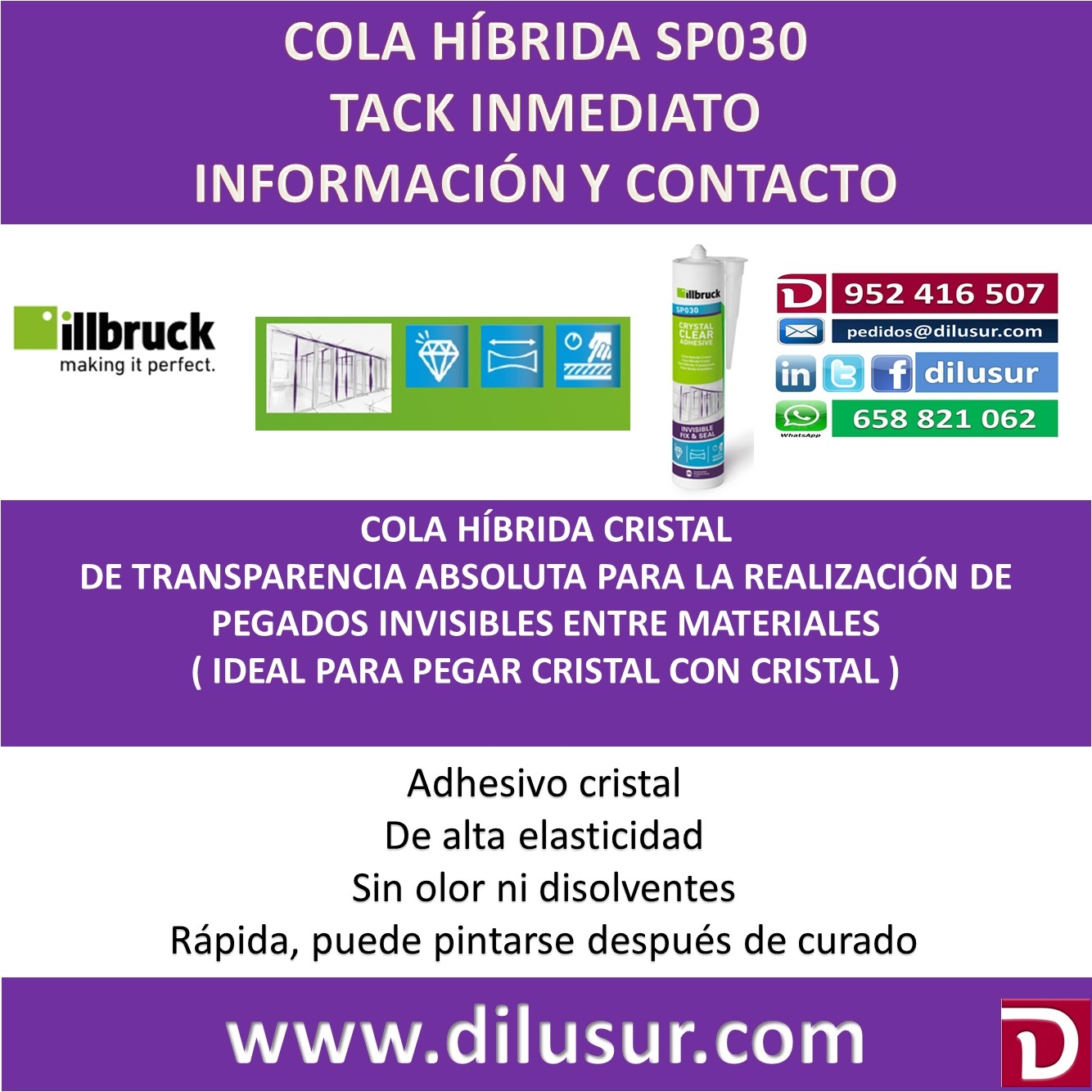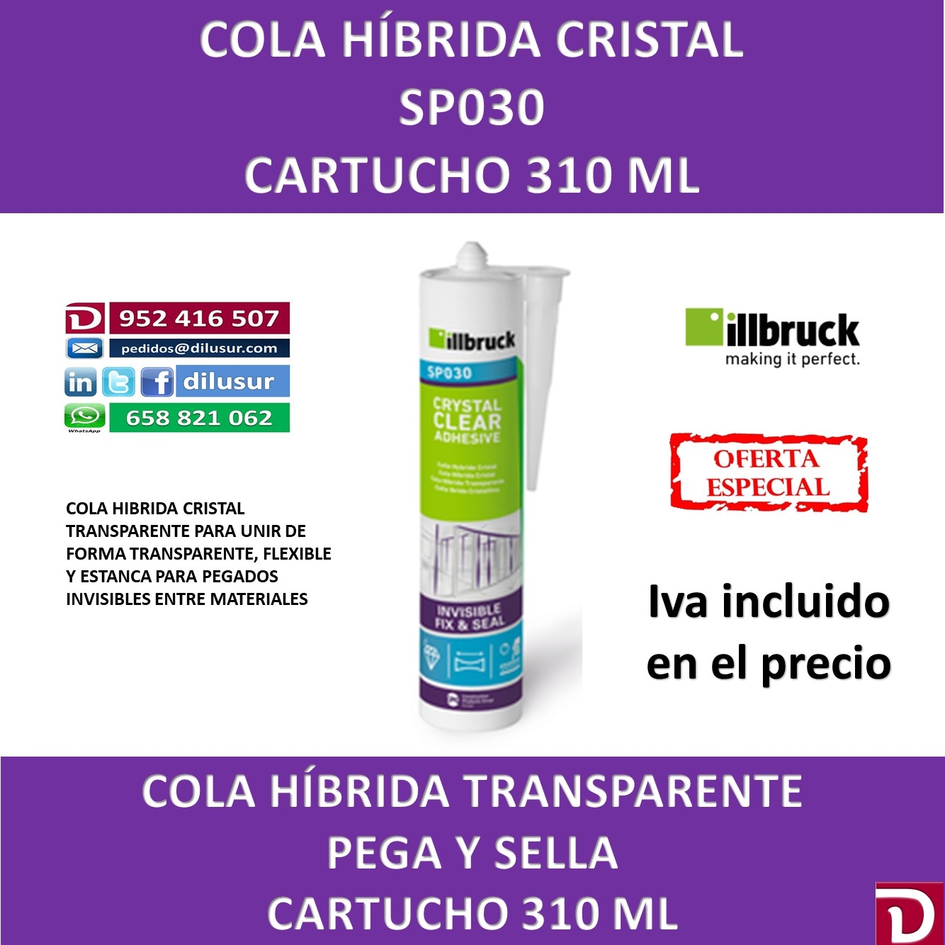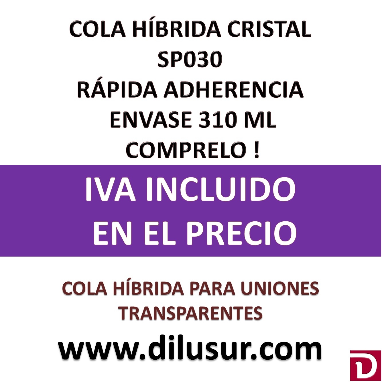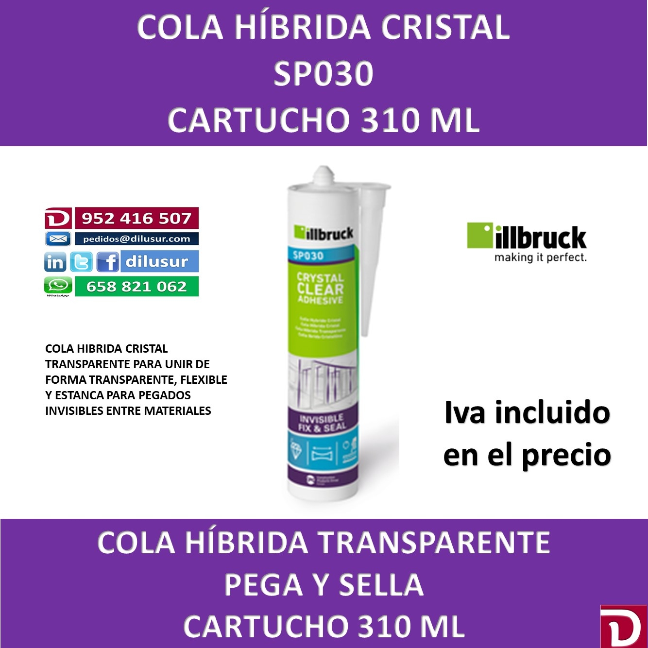 Cola hibrida cristal SP030, está indicada para unir de forma transparente flexible y estanca el vidrio y otros materiales como, el acero aluminio anonizado y bruto. Envase 310 ml. IVA incluido