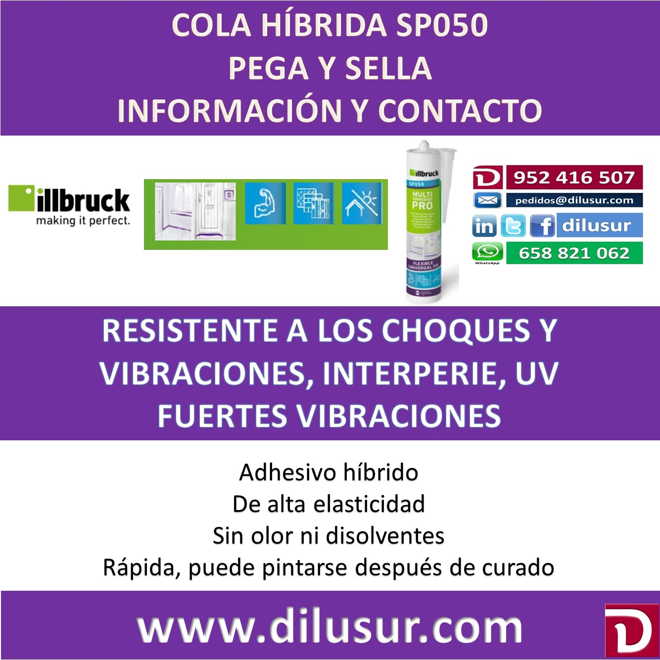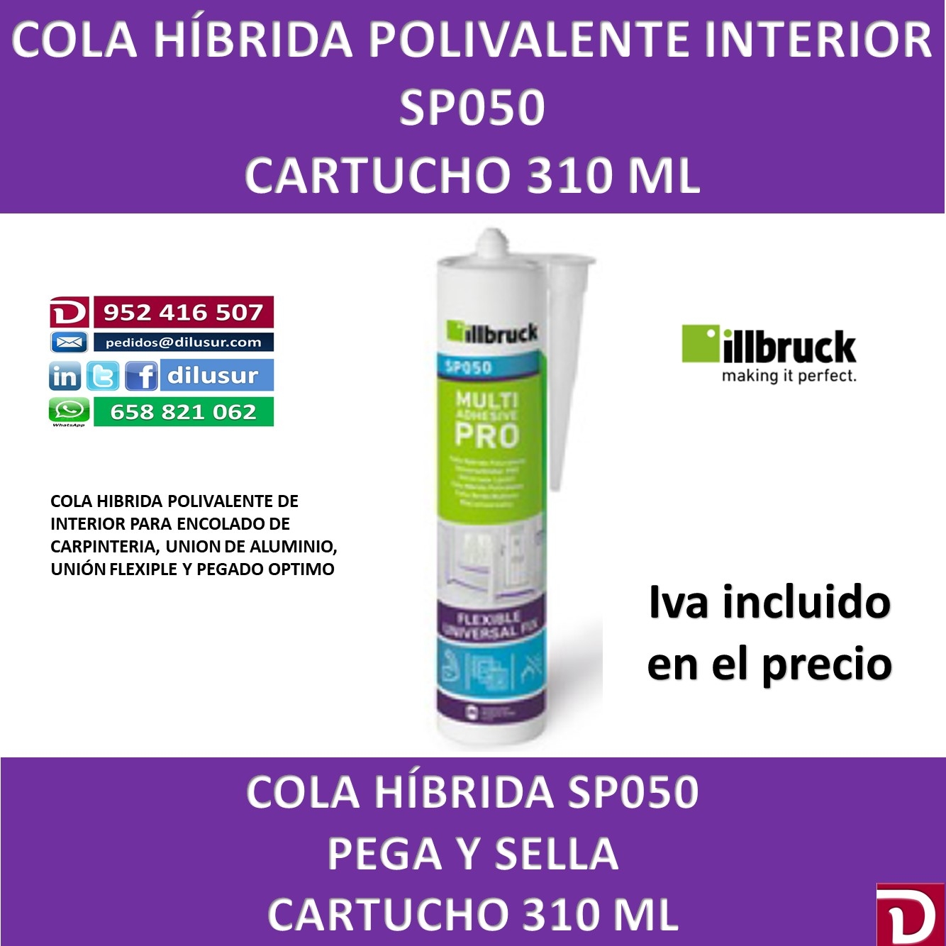 Cola hibrida SP050, para interior adecuada para el encolado de carpintería, unión de aluminio resistente a los golpes, choques y vibraciones. De fuerte unión cuando existe una expansion significativa. Envase 310 ML, IVA incluido