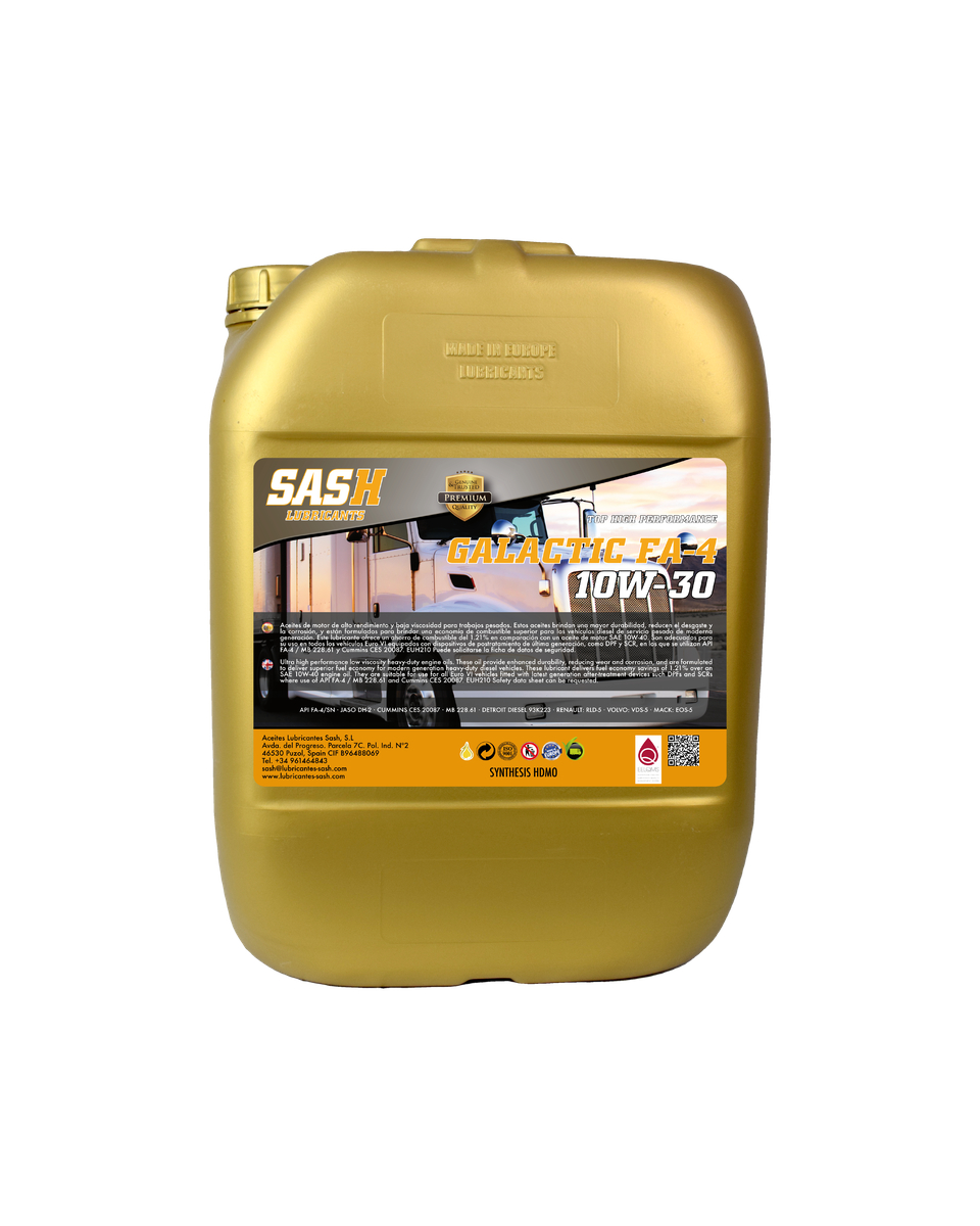 Aceite motor de camión 10W30 FA-4 Galactic de alto rendimiento y baja viscosidad para trabajos pesados. Ahorra combustible en 1. 21%. Apto para todos vehículos que equipen motores euro VI. Bidón 20 L