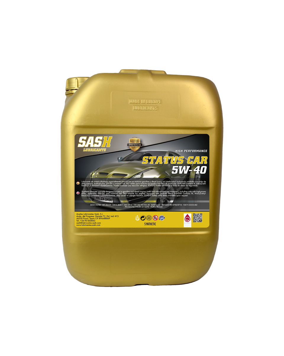 Aceite motor de coche 5W40 Status car, sintetico para gasolina y diesel ligeros, (con y sin catalizador) incluyendo turboalimentados de alta potencia, multiválvulas, GTI y TDI, Turbocompresor y Common- rail. Bidón 20 L