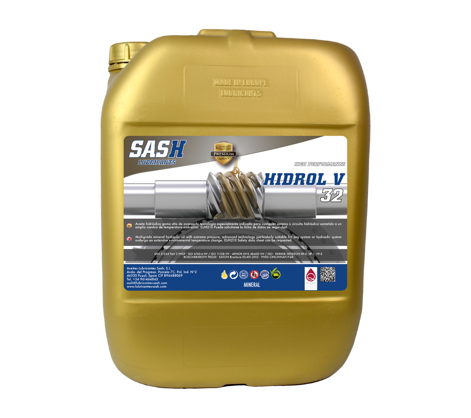 Aceite hidráulico HV 32, Hidrol V, de uso universal y compatible con cualquier lubricante de la misma categoría ( se puede mezclar ), amplio rango de temperaturas de trabajo, Bidón 20 L