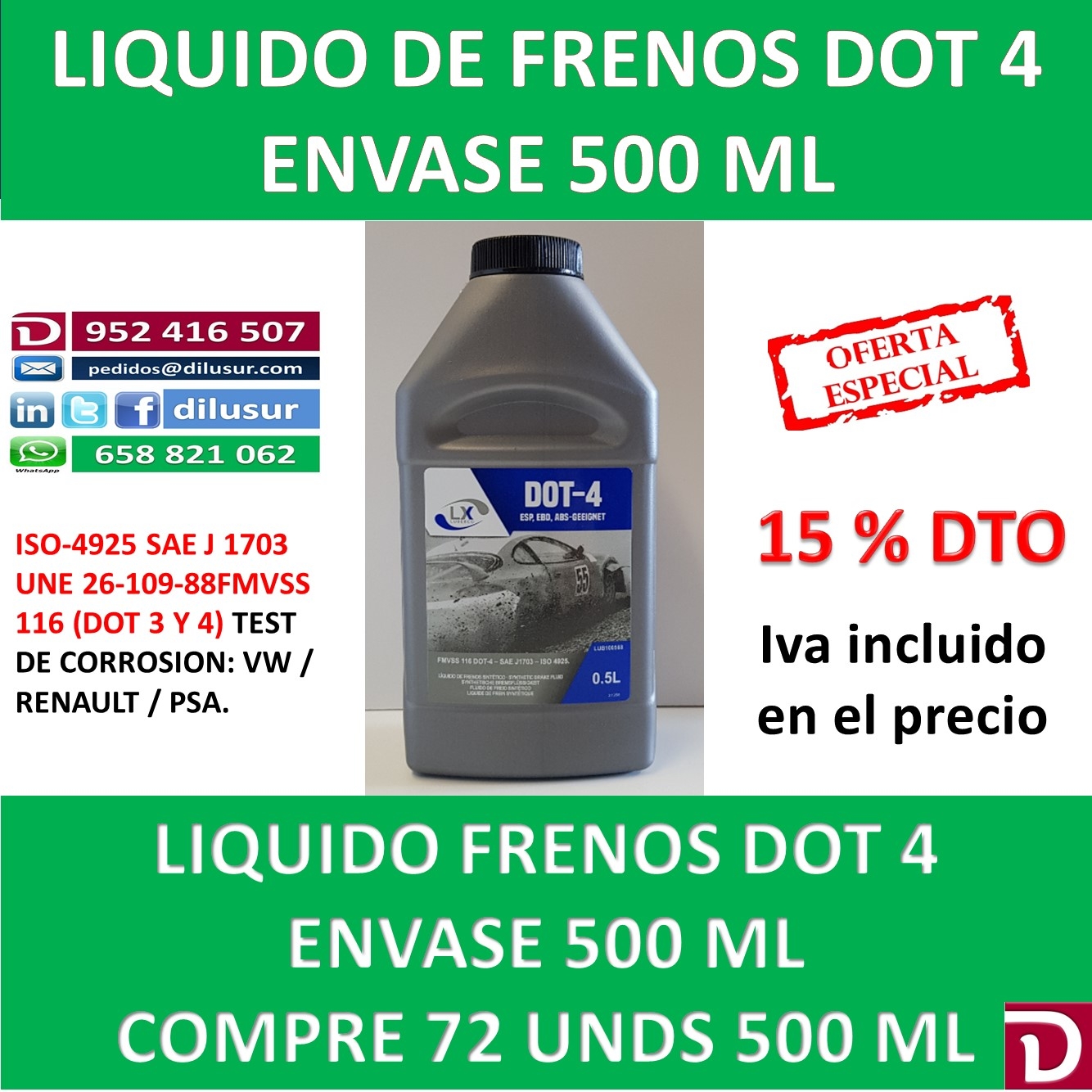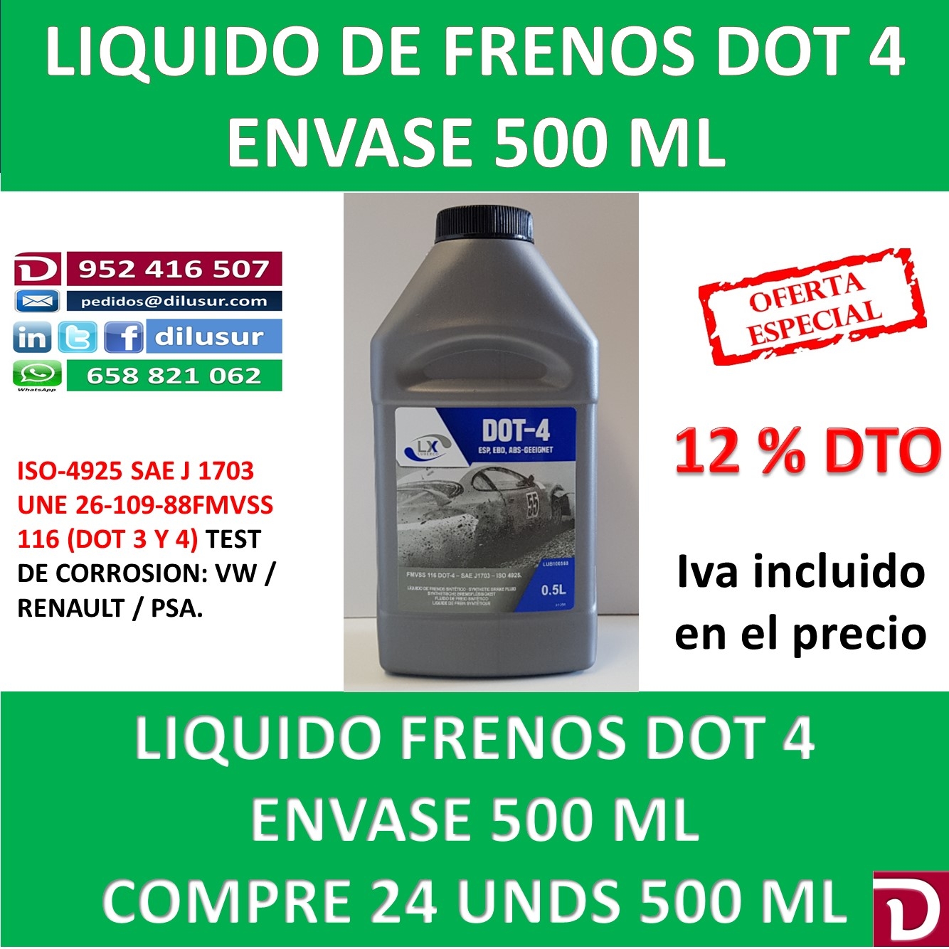 Liquido frenos sintetico 100% DOT 4 ABS, universal para frenos y embragues apto para ( ESP-ABS) compatible con todo tipo de liquidos de frenos, se puede mezclar apto para coches,camiones y motocicletas y maquinaria. Envase 500 ML, caja 24 unds.